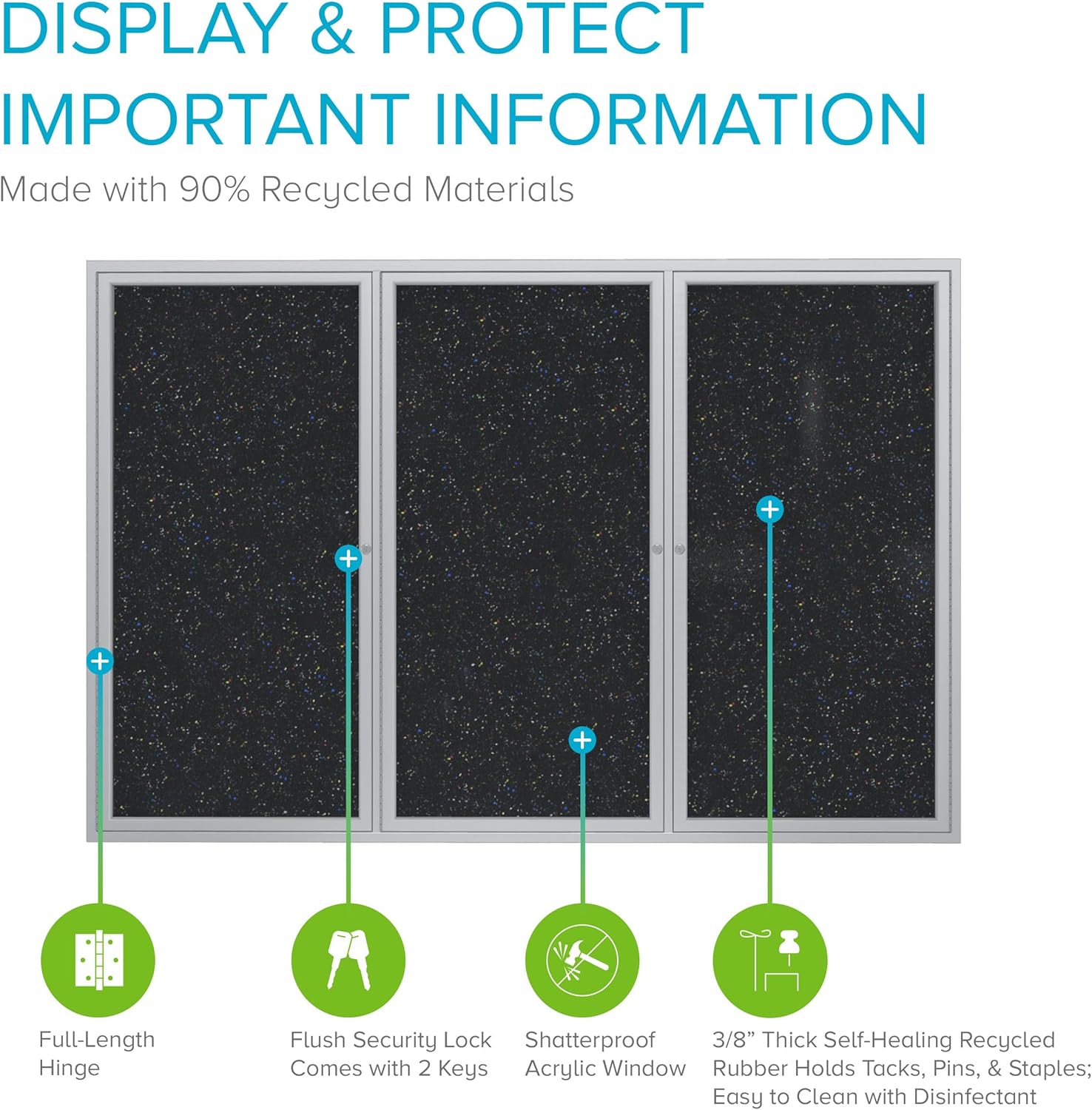 Ghent 36"x72" 3-Door indoor Enclosed Recycled Rubber Bulletin Board, Shatter Resistant, with Lock, Satin Aluminum Frame, Confetti (PA33672TR-CF) ,Made in the USA