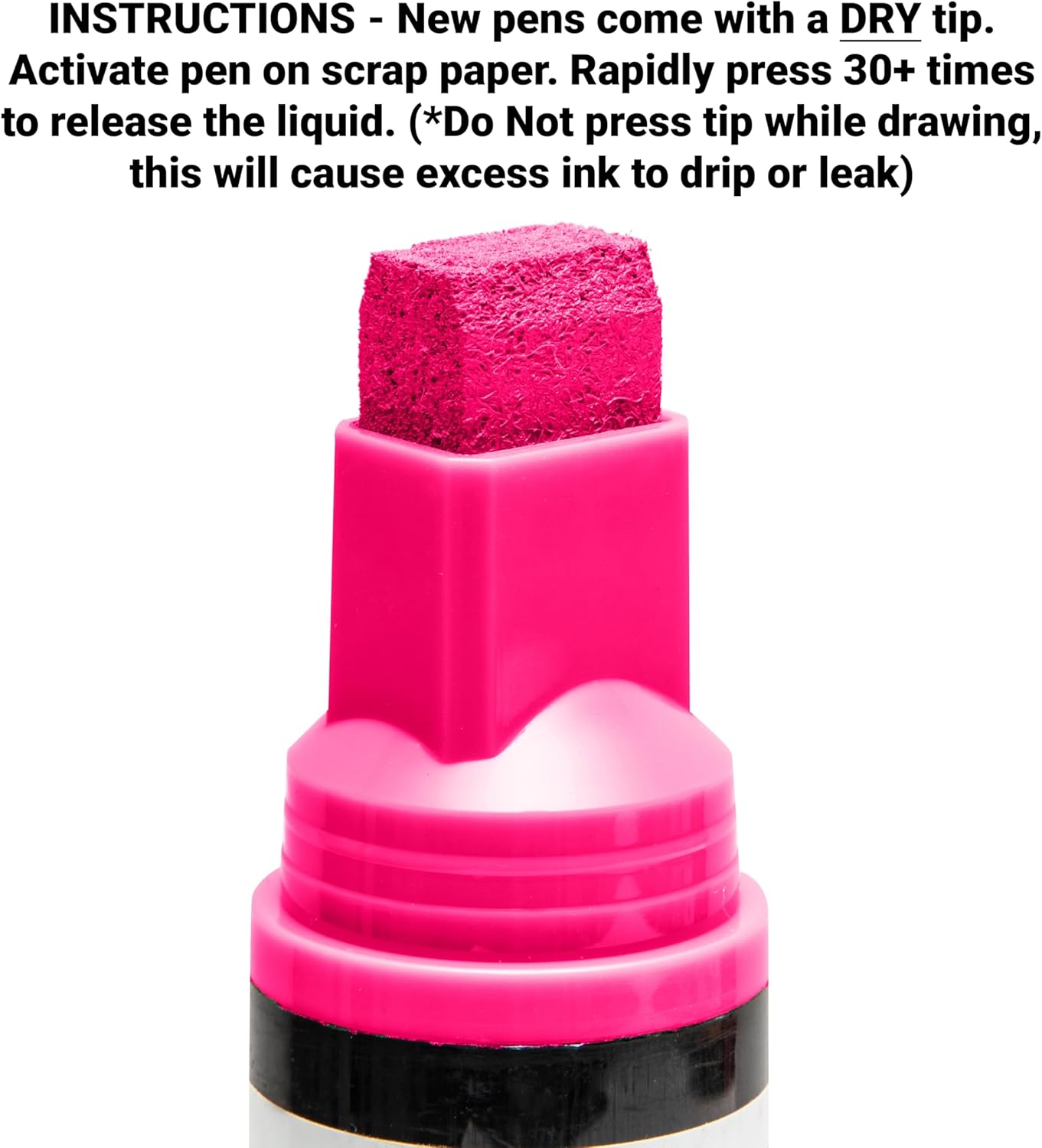 - INSTRUCTIONS TO START- Activate new pen on a scrap piece of paper. Gently press 20-30 times to release the liquid inside. (Do Not pump tip while writing, this will cause excess ink to drip or leak.)