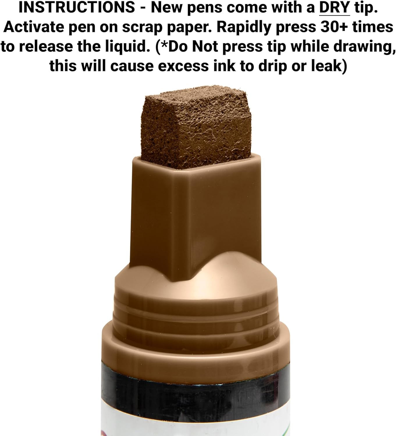 - INSTRUCTIONS TO START- Activate new pen on a scrap piece of paper. Gently press 20-30 times to release the liquid inside. (Do Not pump tip while writing, this will cause excess ink to drip or leak.)