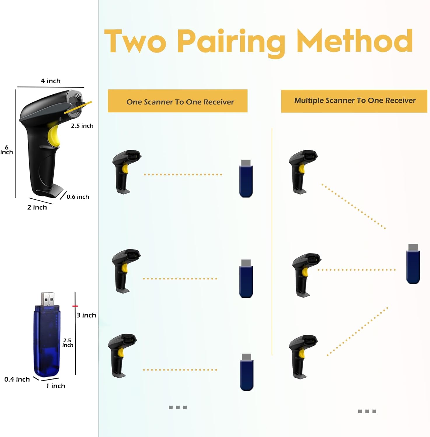 - Two paring mode: One-to-one mode,More-to-one mode. At one-to-one mode,one scanner only transmit barcode to the one usb receiver. AT More-to-one mode,Multiple scanners can transmit barcode to the one usb receiver - ideal in a warehouse where several people are scanning at once.