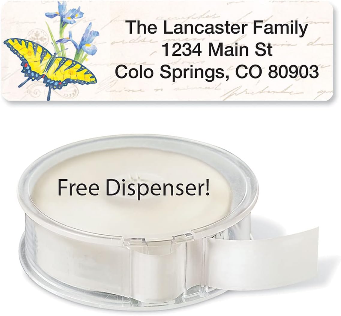 Butterflies & Flowers Rolled Personalized Return Address Mailing Labels with Dispenser, Set of 500, 5 Designs, Small ¾ x 2½ Inch Size, Custom Self-Adhesive Sticker Roll, by Colorful Images