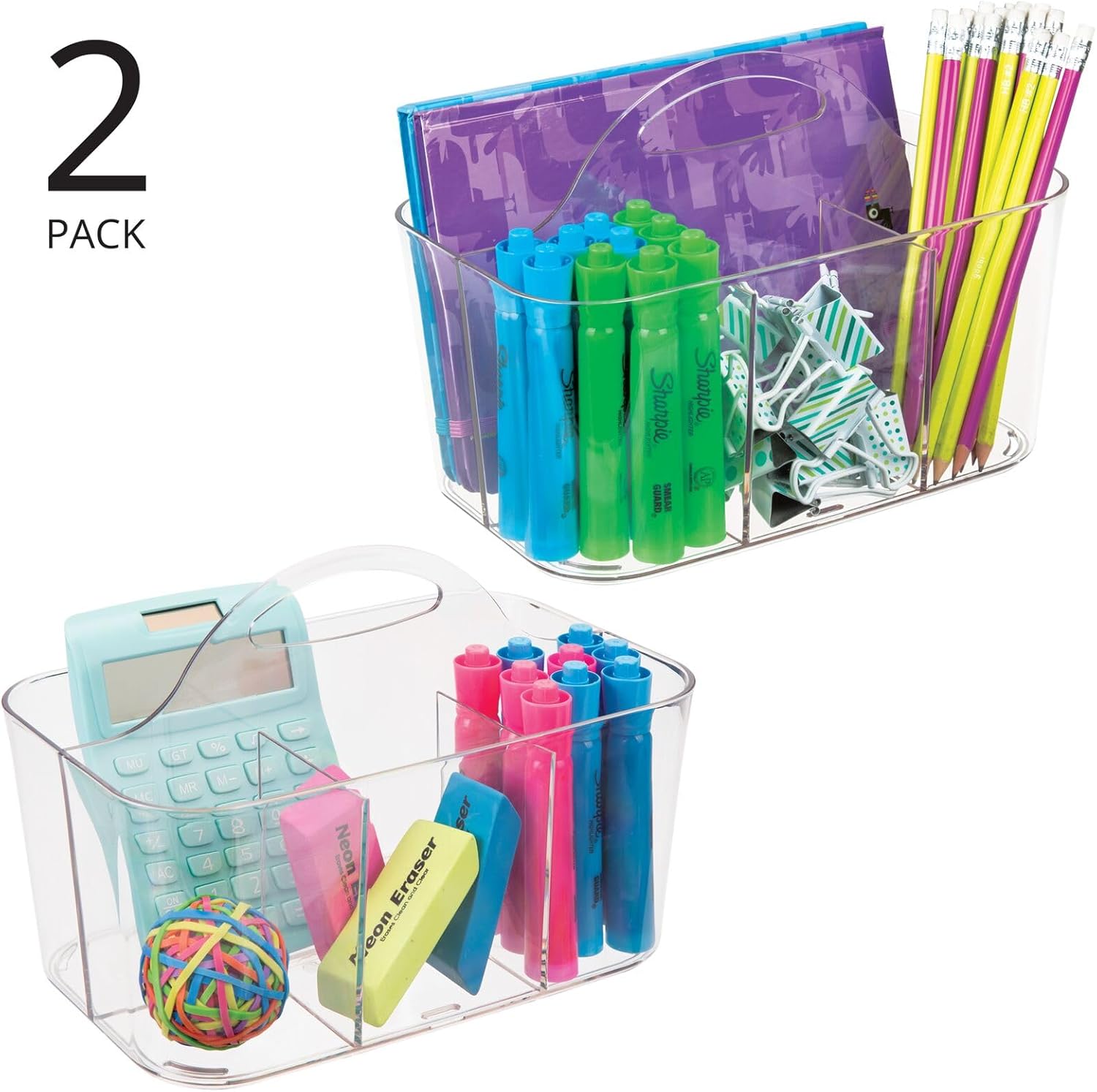 mDesign Plastic Small Office Storage Organizer Utility Tote Caddy with Handle for Cabinets, Desks, Workspaces - Holds Desktop Office Supplies, Pencils, Staplers Lumiere Collection, 2 Pack, Clear