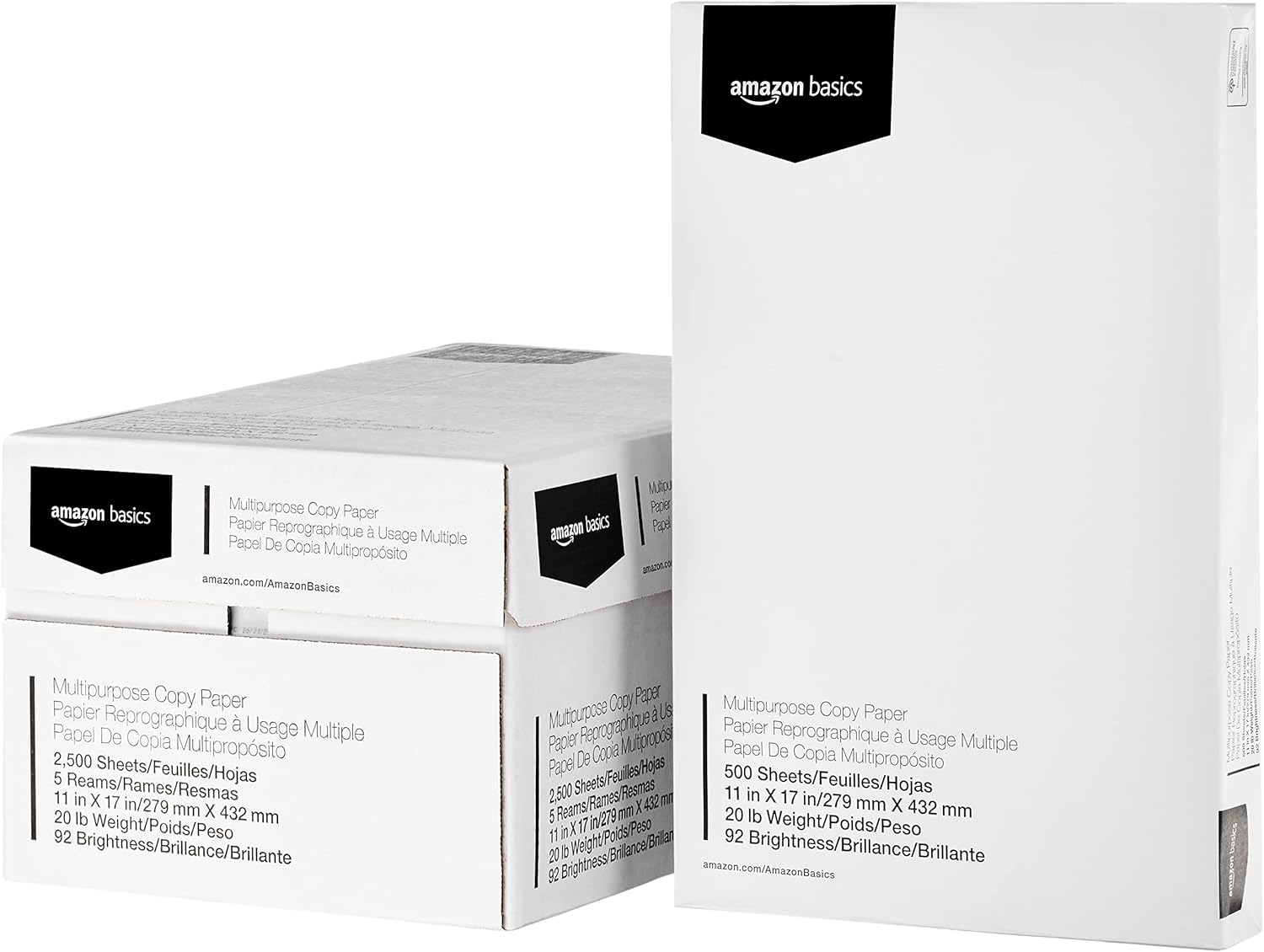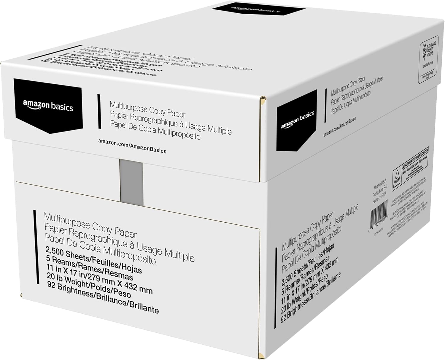 Amazon Basics Multipurpose Copy Printer Paper, 20 lb, 11 x 17 Inches, 5 Reams (2,500 Sheets), 92 Bright, White