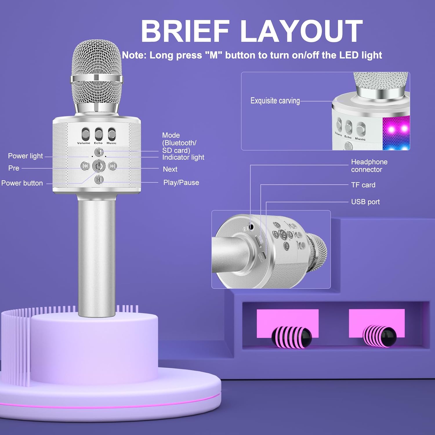 BONAOK Karaoke Microphone for Kids & Adults - Bluetooth Microphones Singing Mic with Disco Lights, Echo Effect, Built-in Speaker Portable Karaoke Player for Party Travel Gifts Q78(Silver)