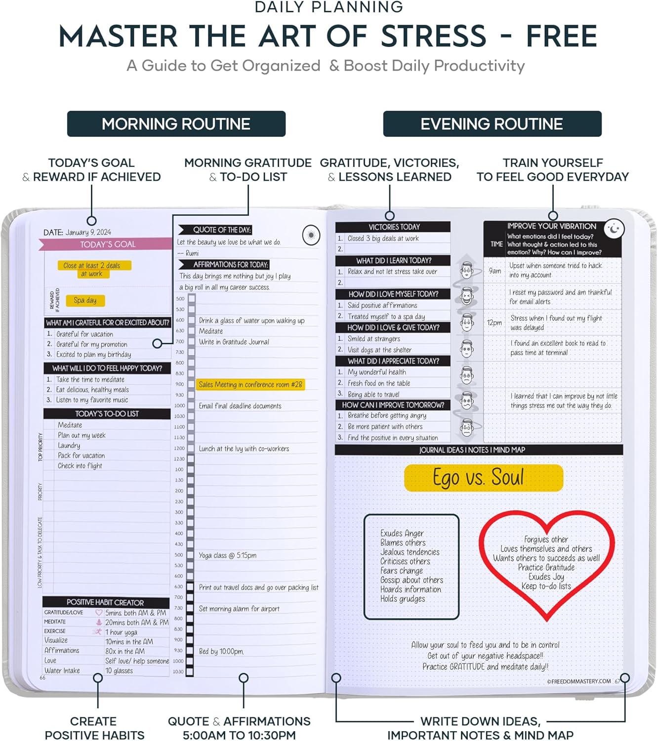 - LUXURIOUS AND TOP QUALITY - Self-care journal for women and men, perfect for entrepreneurs, professionals, college students and everyone who has burning desire to turn dreams into reality! FREE VIDEO MINI-COURSE: You will learn 10-min morning routine used by the most successful people to 10-fold your productivity, focus, happiness & passion! You will master setting goals & fix procrastination!