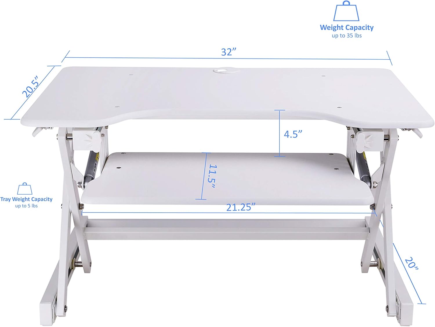 - RETRACTABLE ERGONOMIC KEYBOARD TRAY: 4.5" spacing between keyboard tray and desktop keeps monitor at proper ergonomic height to prevent neck strain while sitting or standing, keyboard tray extends for optimum comfort. Large 21" x 11" keyboard tray size will hold a laptop if needed.