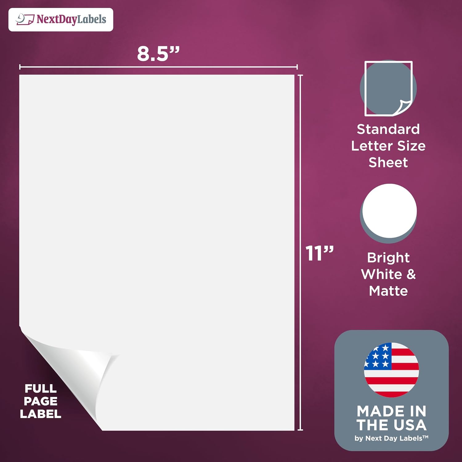 NextDayLabels - Full Page Labels 8.5 x 11 - White Shipping Labels - 8.5 x 11 Label Paper for Printer - Large Blank Matte Sticker Printer Paper - Laser/Inkjet Printer Labels (1 Per Sheet, 50 Labels)