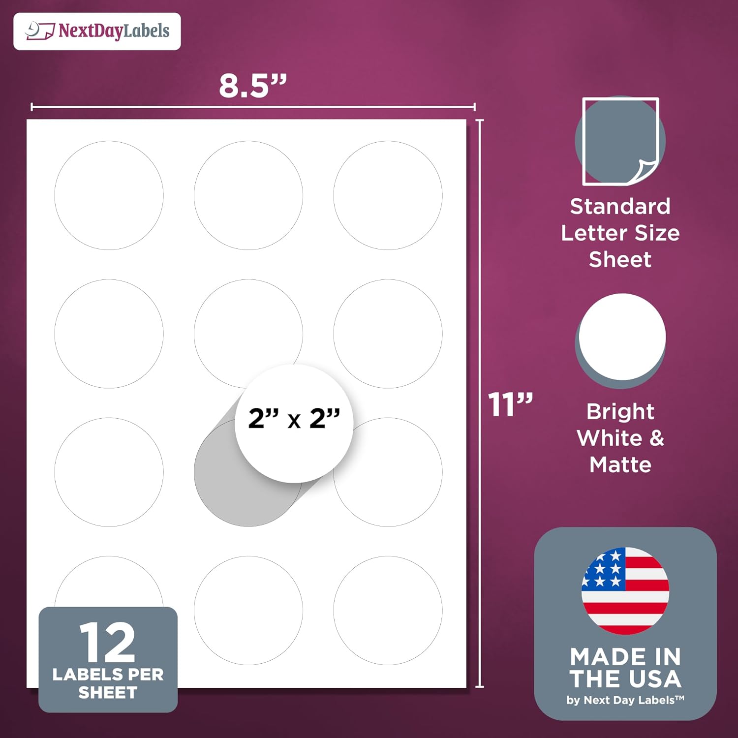 NextDayLabels - 2 Inch Round Circle Stickers - Matte White Blank Laser/Inkjet Printer Labels (300 Labels, 25 Sheets, 12 Per Sheet)