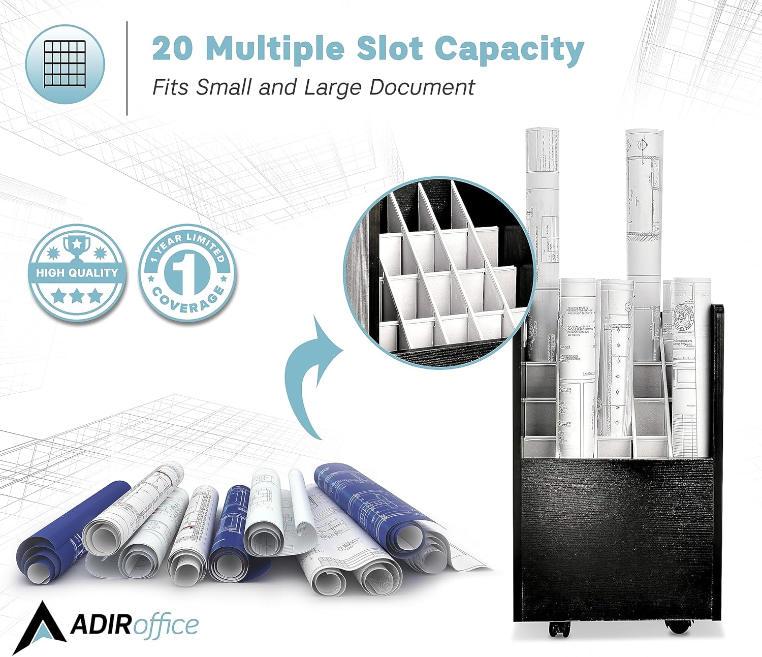 Adir Blue Print Storage Organizer - Mobile Roll File Cart, Construction Plan Holders, Blueprint Cabinet with Wheels, Roll Files Storage for Office and Home (20 Slots, Black)