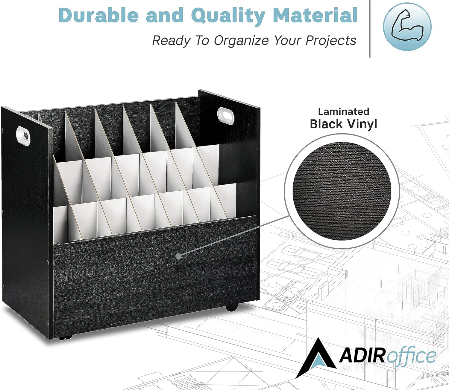 - Stylish and functional: The Adir’s plans organizer combines aesthetic appeal with practical design. Its sleek vinyl laminate finish complements any decor. With a 50-pound weight capacity and sturdy construction, this rolled document storage is built to last.