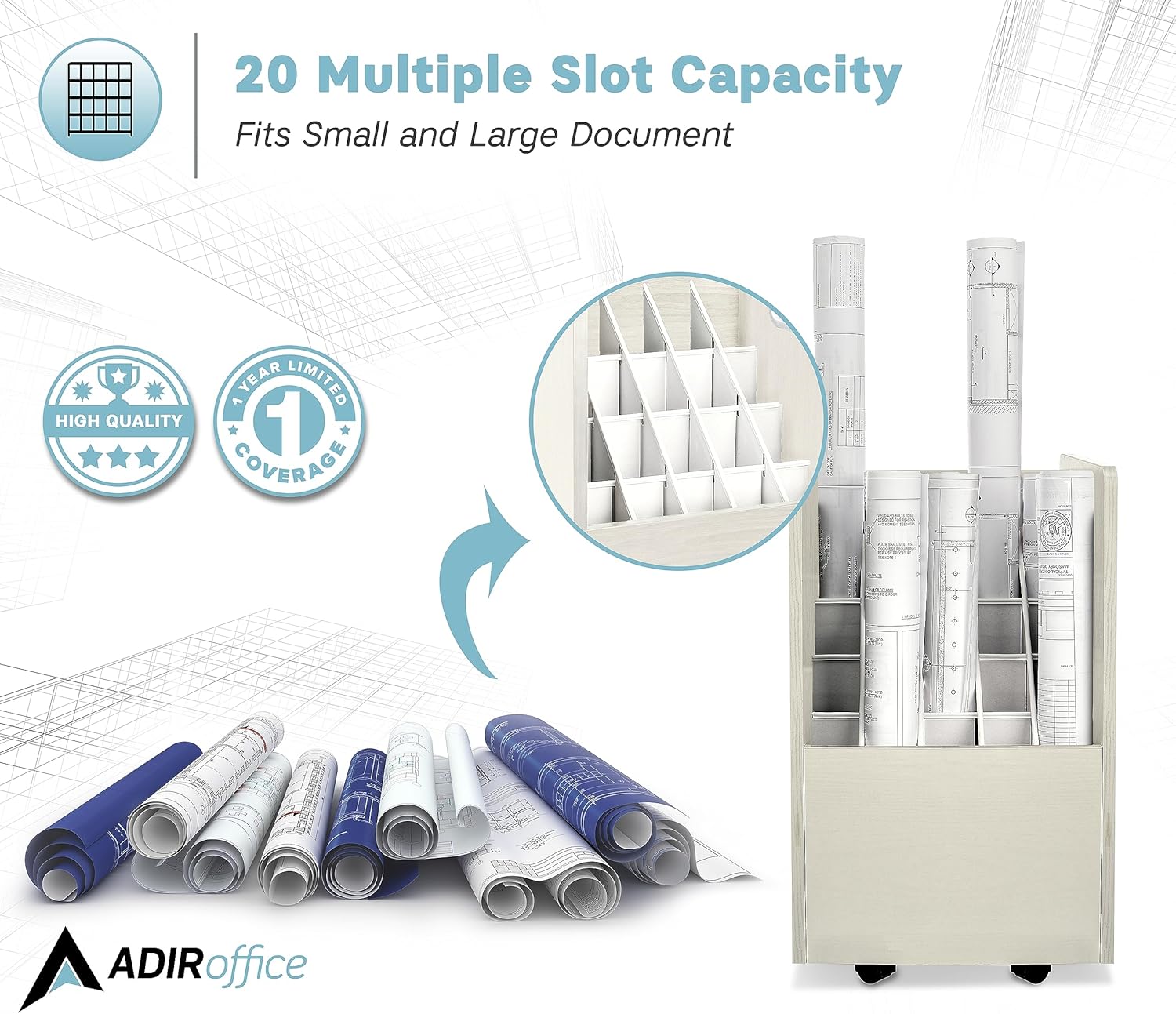 - Versatile use: Adir’s rolled files organizer serves multiple purposes. It can be used as a blueprint storage cabinet, rolled poster storage, vinyl roll holder, map storage cart, architectural plan storage, and more.