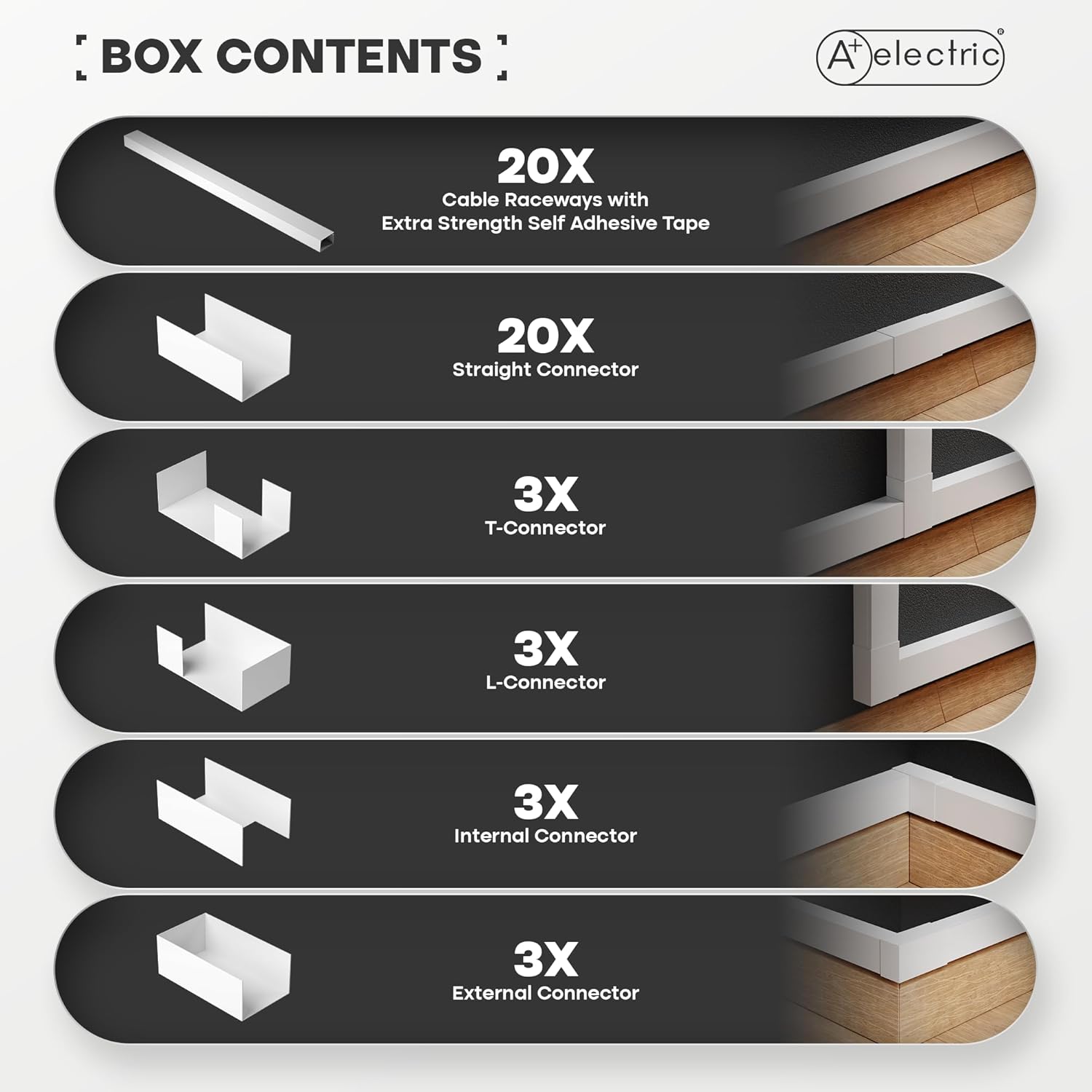 - PREMIUM CABLE CONCEALER KIT: A Plus Electric Paintable Wire Hider Kit is an excellent cord organizer.It is designed to conceal messy and unorganized cables in your home or office. Each Package contains 20 Channels and Fittings; 20xDrywall Anchors&Screws,3xL Connectors, 3xT Connector, 3xInside Corner, 3xOutside Corner, 12xStraight Connectors