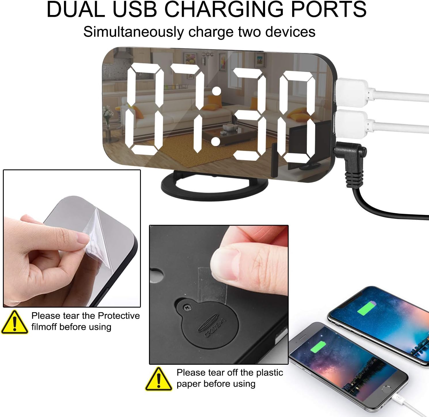 Digital Clock Large Display, LED Alarm Electric Clocks Mirror Surface for Makeup with Diming Mode, 3 Levels Brightness, Dual USB Ports Modern Decoration for Home Bedroom Decor-Black