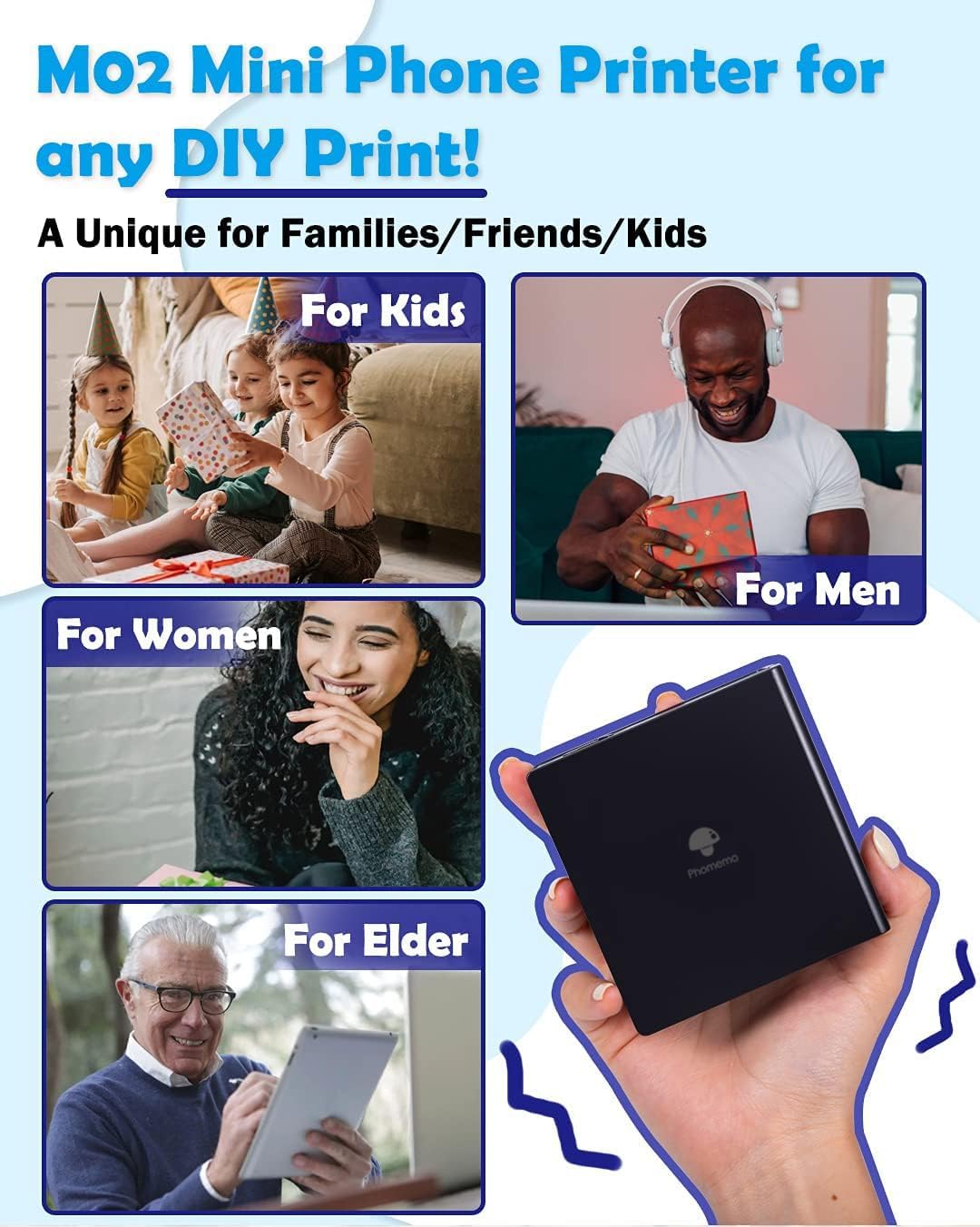 - Multipurpose- Phomemo M02 portable mobile printer is better for company business, work plan, office assistant, memo, meeting notes, study notes, shopping list, receipts. Suitable for office, students, amateur archivists, treasure moms etc