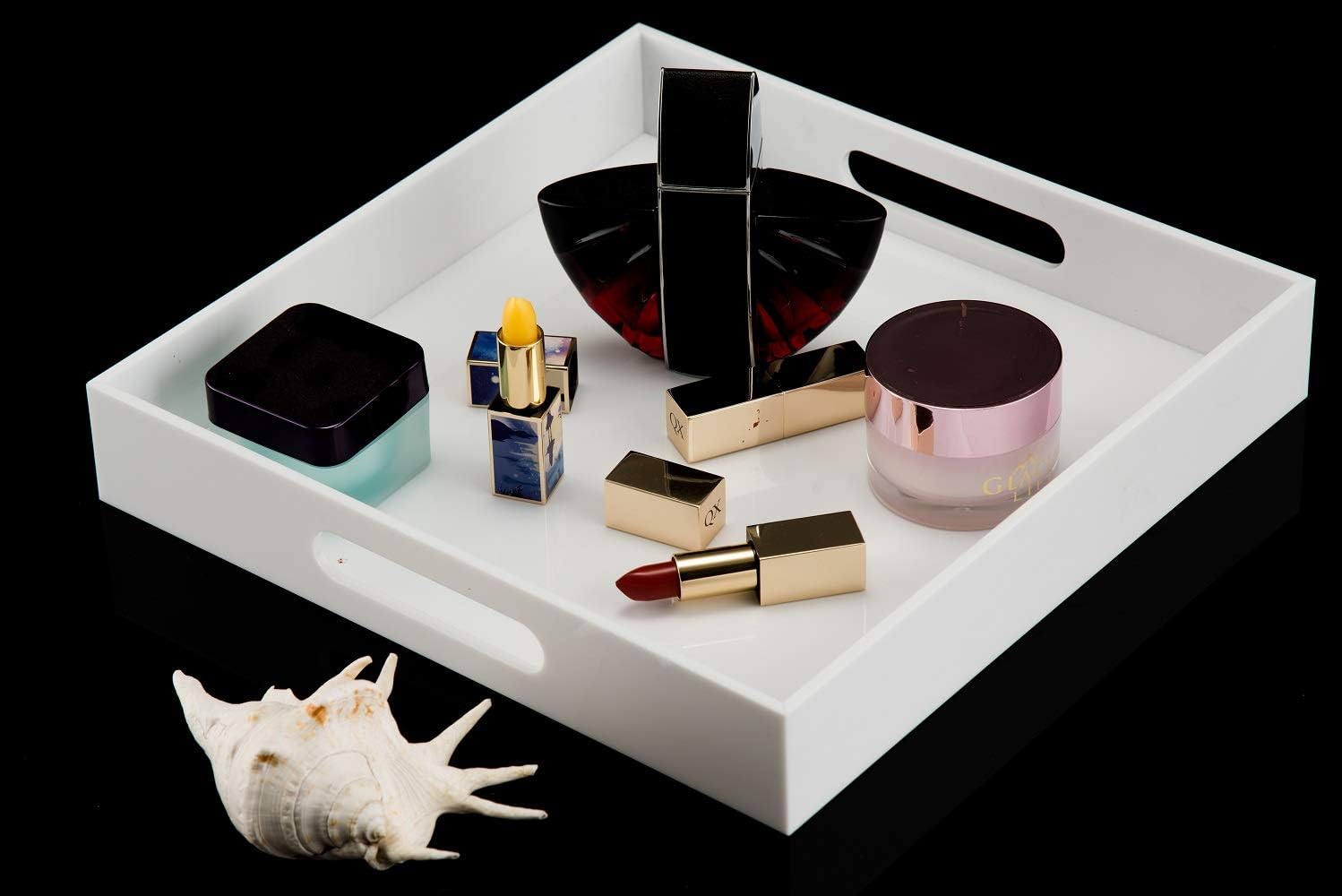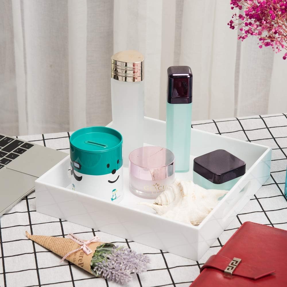 Glossy White Sturdy Acrylic Serving Tray with Handles-10x10Inch-Serving Coffee,Appetizer,Breakfast,Butler-Kitchen Countertop-Makeup Drawer Organizer-Vanity Table,Ottoman Tray-Decorative Tray