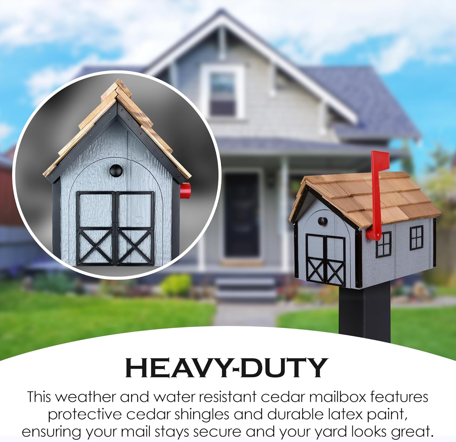 - WATERPROOF: This wooden mailbox will keep your mail dry and safe from the elements. The cedar shingles serve as a roof to keep the contents dry. The base of the wooden mailbox is covered with exterior-grade latex paint to protect it from the weather.