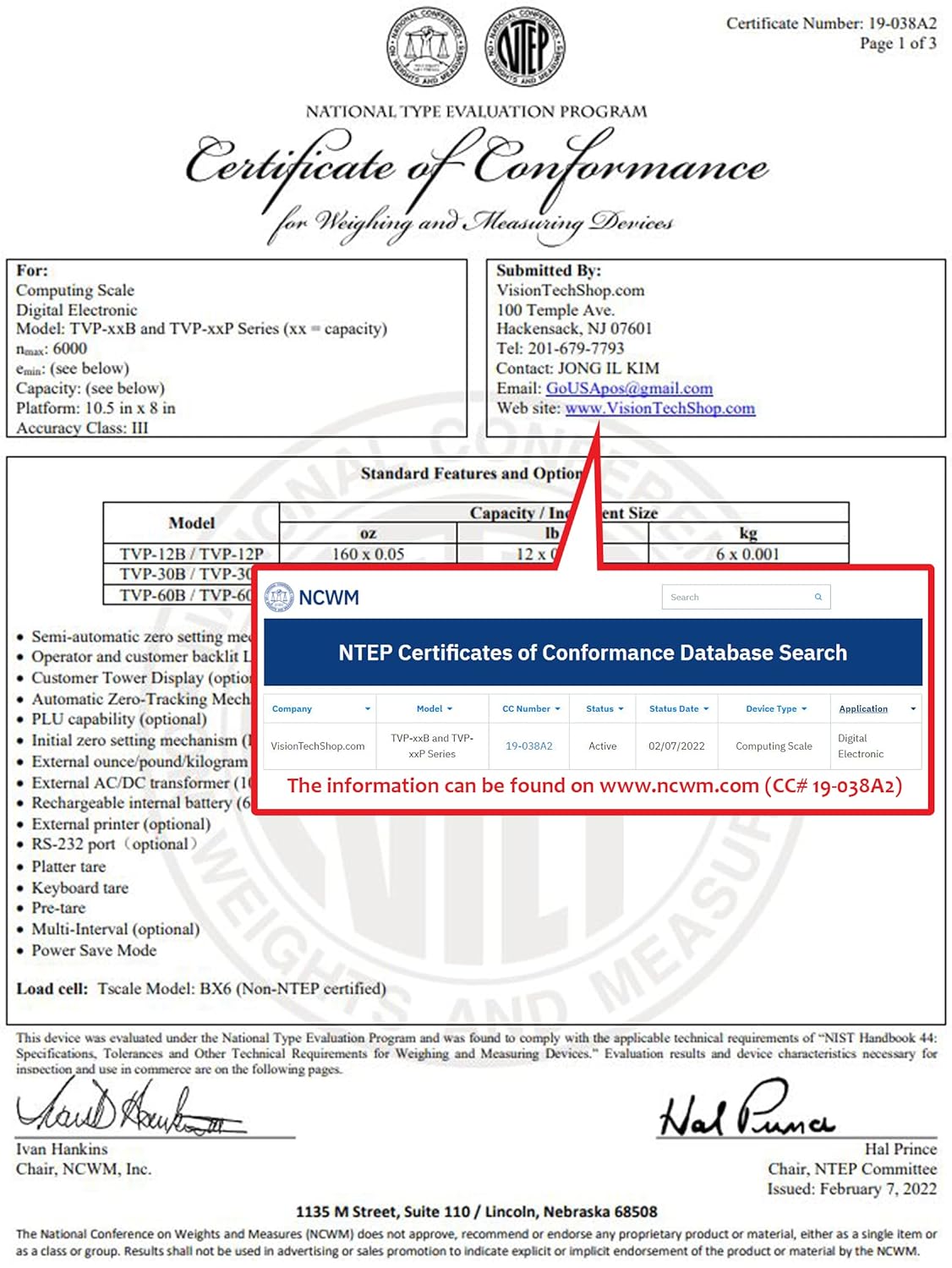 - Lb/Oz/Kg switchable, Easy Operating, NTEP Approved Legal for Trade, Coc #19-038, NSF Certified