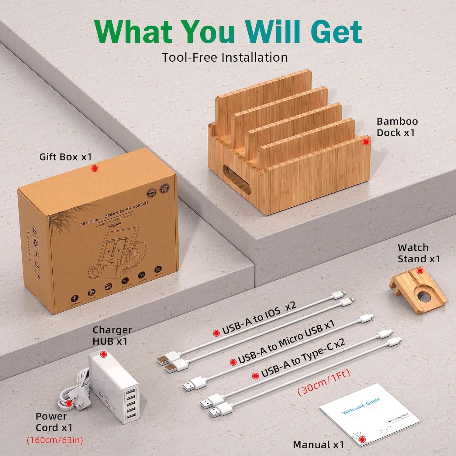 - What You Get: 1 Bamboo Charging Station , 1x USB Charger and Cord, 5 Cables(Included 2x 1OS cables, 1x Android cable, and 2x Type-C cables). One piece of USB Charging HUB(5Ports), and CORD, an extra Hanging Stand for Smart Watch, and 5 Charging Cables (1Ft). All these fit perfectly in the charging dock