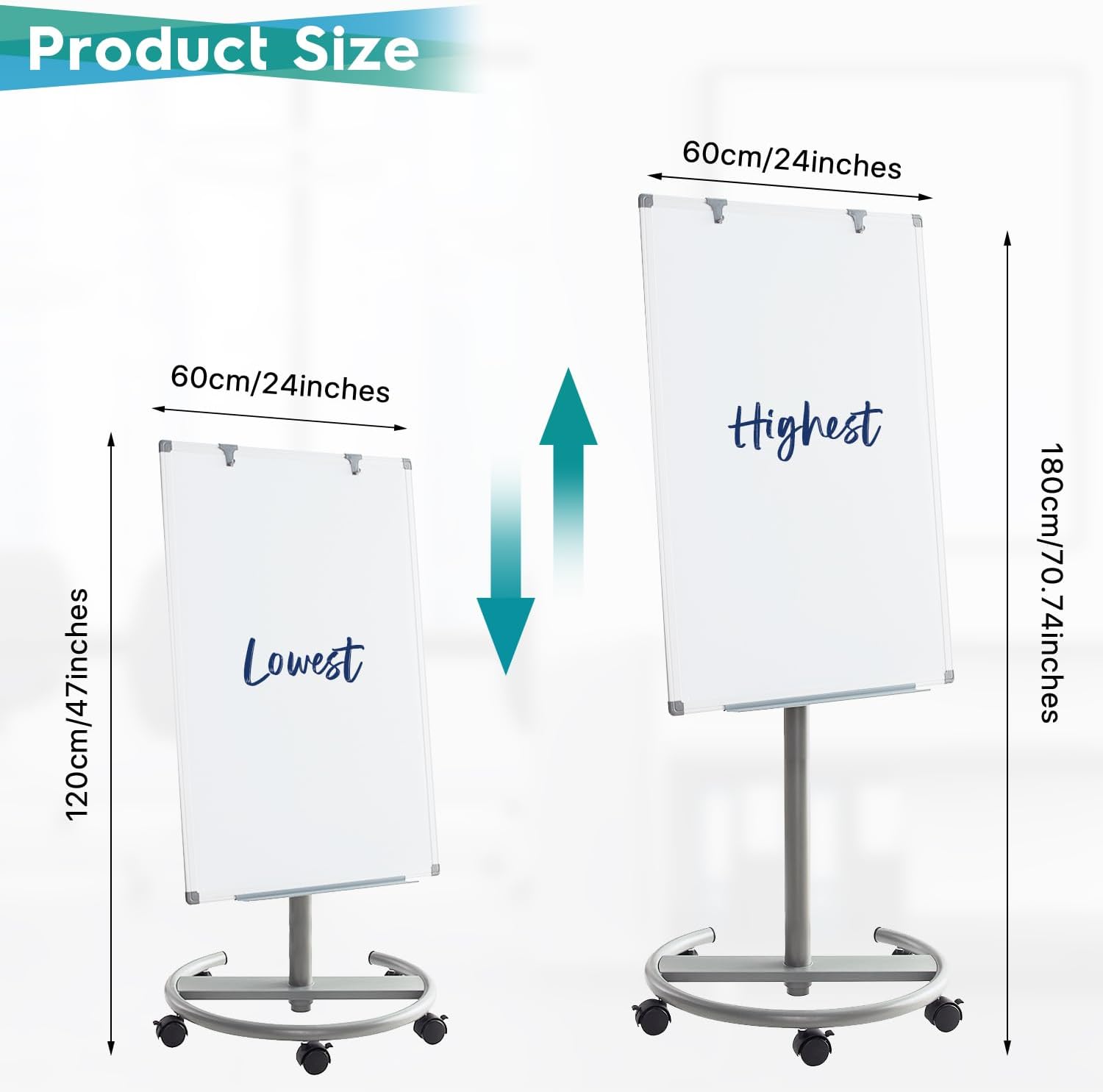 - Movable & Stable: With round wheel base design, rolling white board can be easily moved and carried to any classroom, conference room, or studio. Each wheel has a lock to ensure that it does not slide during use