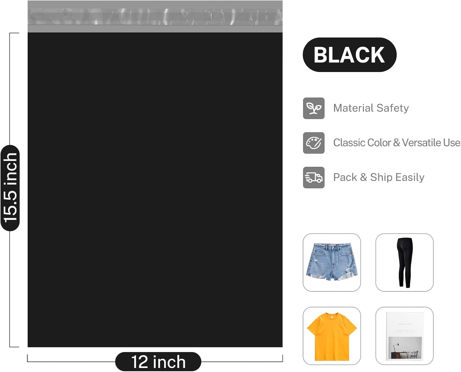 - Black 12X15.5 Poly Mailers - Our poly mailers are a reliable shipping and packaging solution for your retail or online business. These poly mailer envelopes measure 12x15.5" inches and come in a pack of 100. These poly mailers are lightweight and easy to ship. They are a great alternative to bulky and expensive shipping boxes. Poly mailers are durable!