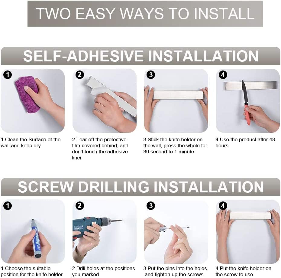- โ NO DRILLING & WALL MOUNTED: Our kitchen magnetic knife holder has been designed for two installation way to meet our different buyer's requirement. One is the adhesive magnetic knife strip can be mounted just by pressing to the wall. Another is this magnetic bar comes with mounting hardware and instructions so you can set up your magnetic knife strip and organize your kitchen right away!