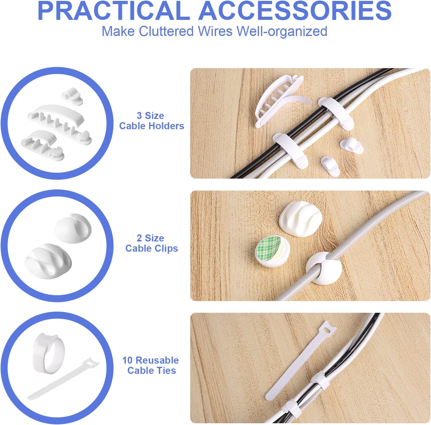 - ACCESSORIES UPGRADE - Our cable management boxes are equipped with 28 pcs cable management set that concludes 6 x One Slot Cable Clip Holders,2 x Triple Slot Cable Clip Holders,2 x Six Slot Cable Clips Holders ,2 x Triple Slot Cord Clips ,6 x One Slot Cord Clips,10 x Reusable Cable Ties.That help you even better organize your cables or wires.