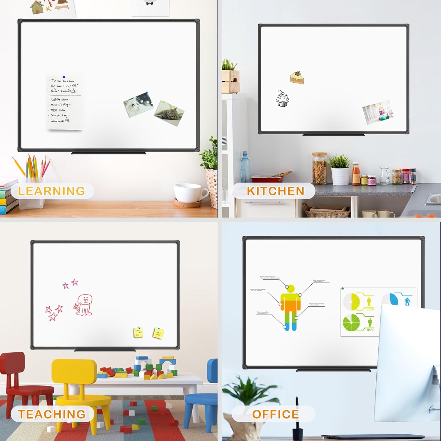- ELEGANT BLACK ALUMINUM FRAME: Anti-Scratch satin black aluminum frame & detachable marker tray, Round nylon corners, Sturdy whiteboard structure perfect organizer for school home and office.