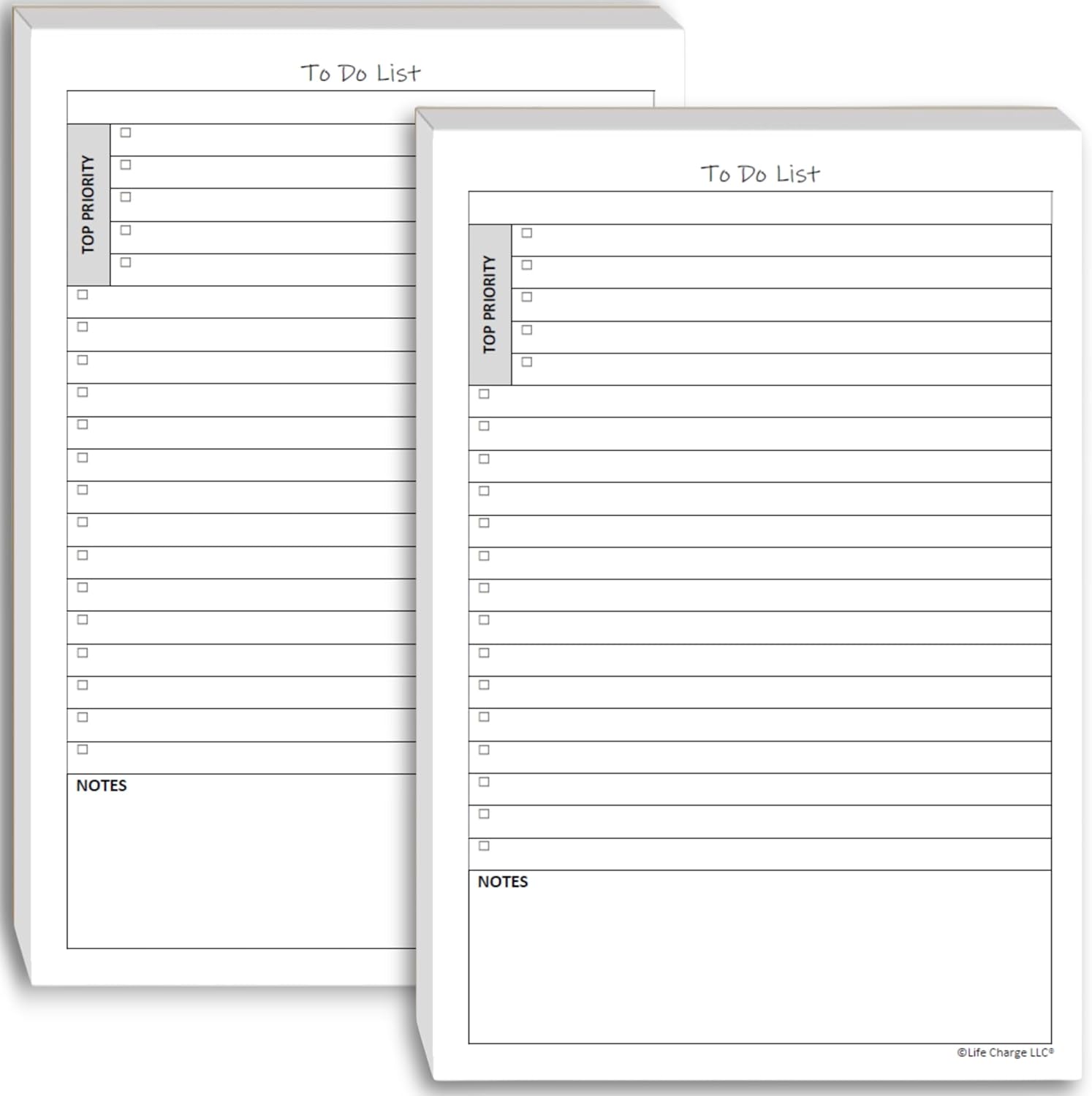 - Two Pack, 50 Pages Each, Total 100 Pages. To do list notepads that house a checklist, a priority section, a notes section. Each notepad has 50 pages. The perfect size, at 5.5”X8.5”. Quality 70 pound smooth white paper with chipboard backing. Clean and elegant looking checklist planner.