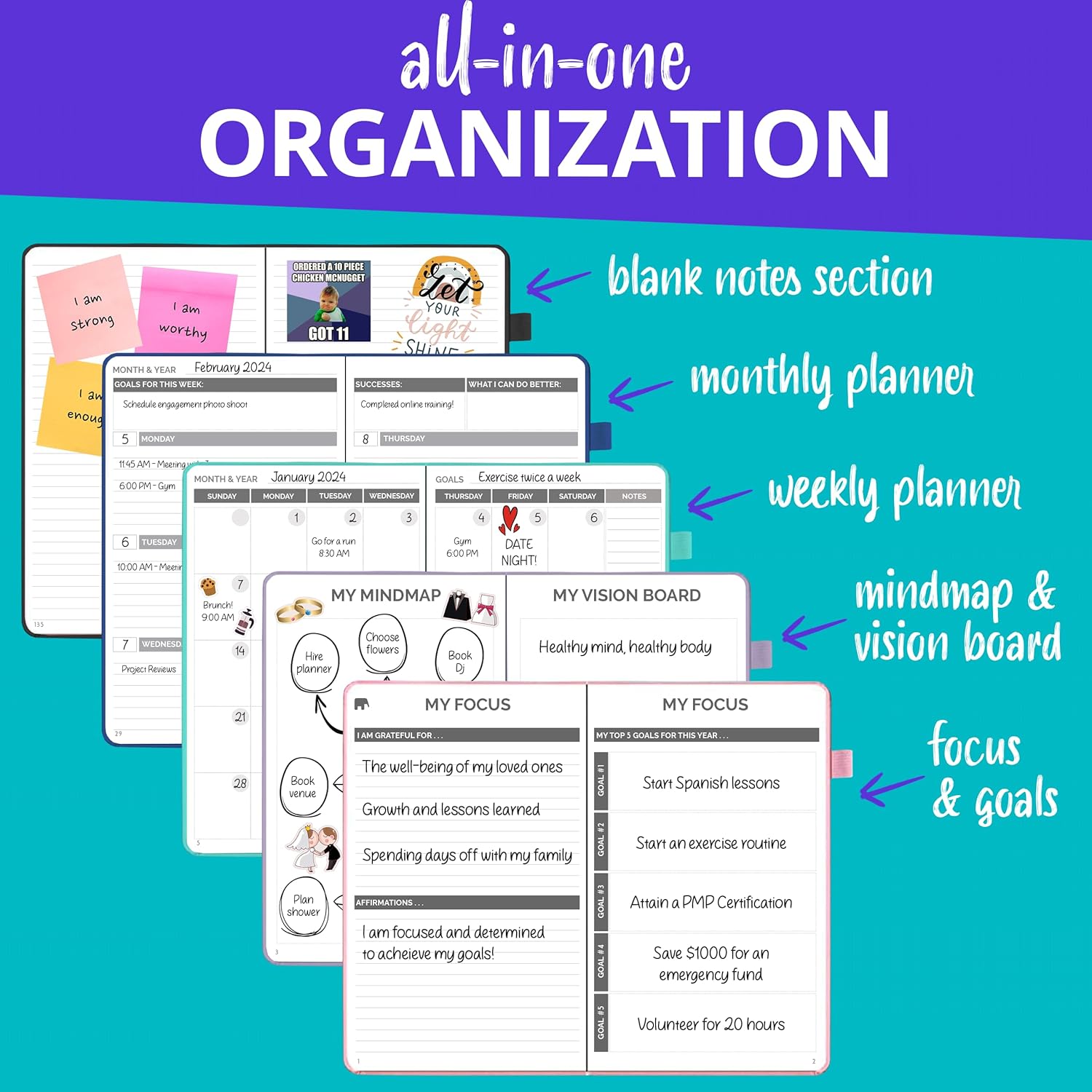 - All-in-One Life Organizer – Includes to-do lists, goal-setting pages, and calendar spreads to manage appointments, tasks, and long-term goals—your all-in-one solution for work, school, and personal life