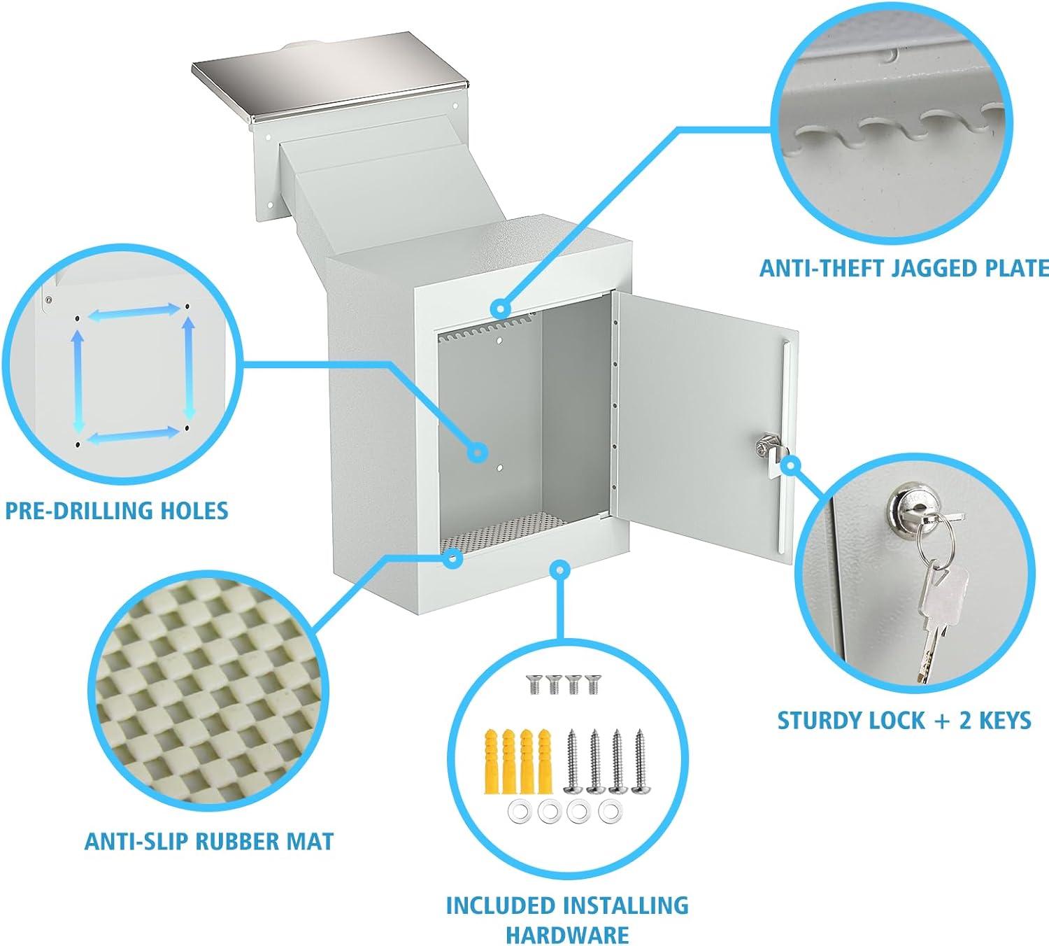 - SECURITY ANTI-THEFT DROP BOX WITH LOCK: POCHAR locking mailbox equipped with a sturdy metal lock can only be accessed with the designated key (come with 2 keys), and cannot be pried open by force. And designed a anti-fishing jagged metal, making it impossible to reach and take out the items inside. And our key drop box provided a rubber mat to reduce moisture and dropping noise.
