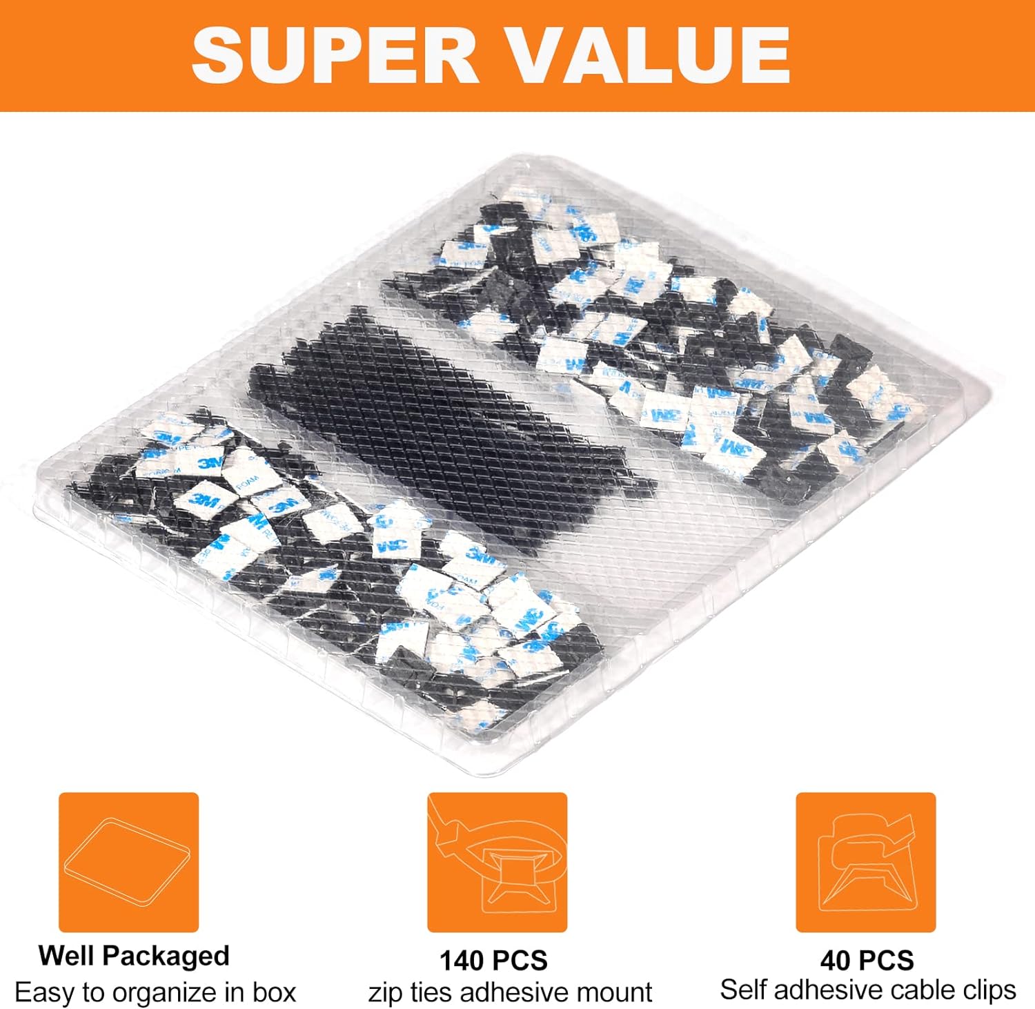 - 【Easy to install and use】:The Zip Tie Adhesive Mounts are fixed by a strong 3M adhesive, with excellent viscosity and durability, no tools, no drilling, and easy to install. Includes 140 adjustable cable ties. Arbitrarily adjust the size to fix the cable. It is also easy to disassemble, and it never destroys the beauty of the furniture.