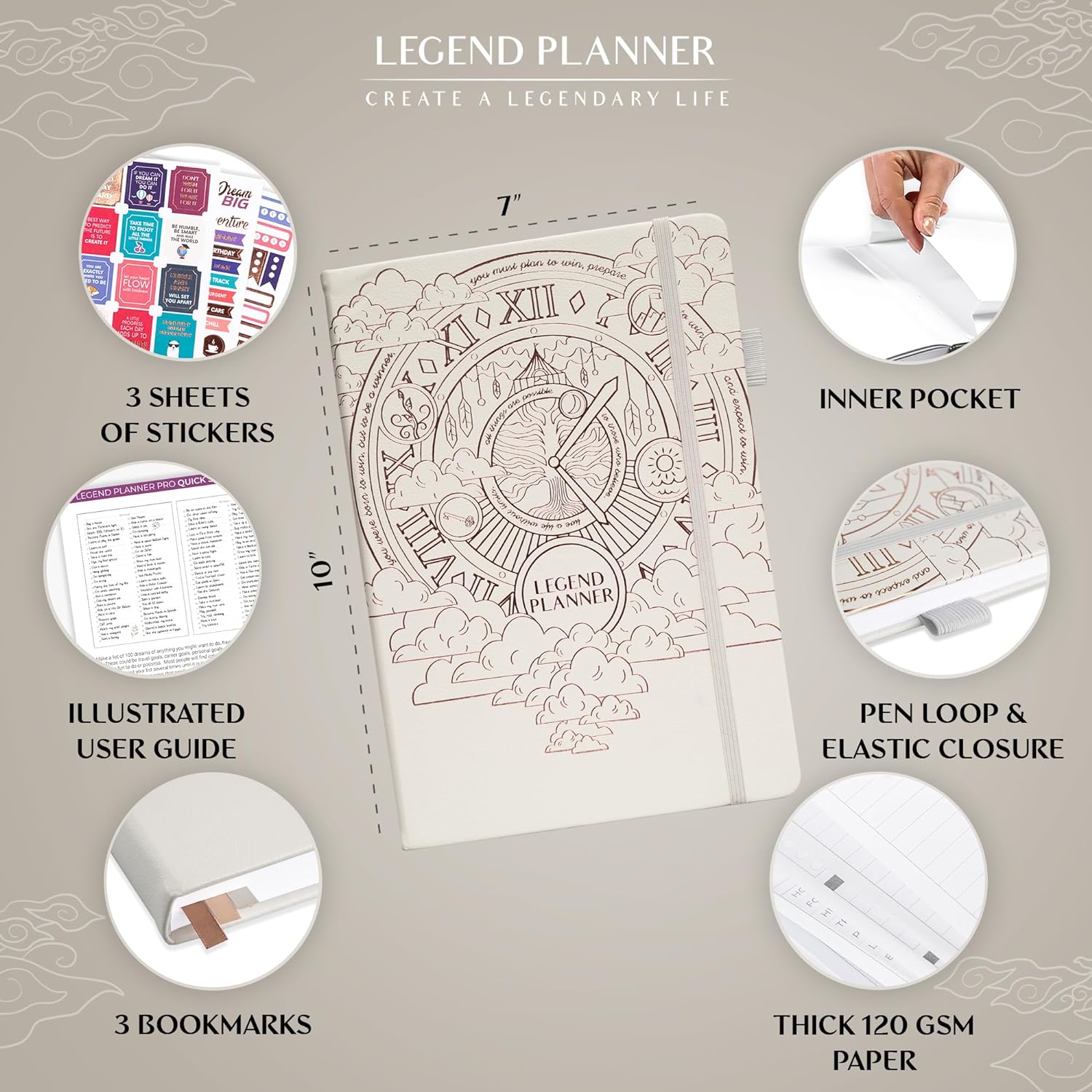 Legend Planner PRO – Deluxe Weekly & Monthly Life Planner to Increase Productivity and Hit Your Goals. Time Management Organizer Notebook – Undated – 7 x 10" Hardcover + Stickers – White