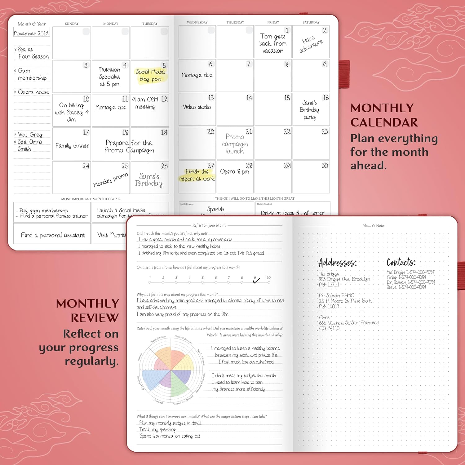 - STAY ORGANIZED & BOOST PRODUCTIVITY – Use spacious monthly calendars and weekly views to plan tasks, deadlines, and appointments. Reflect on your progress regularly with comprehensive monthly reviews.
