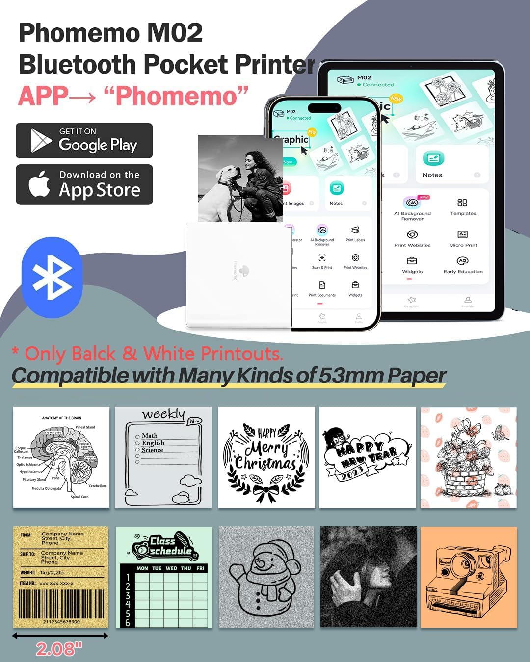 - Bluetooth Mini Thermal Printer- for cell phones and tablets with Bluetooth connectivity, compatible with Android 7.0 and iOS 13.0 or above.The Phomemo M02 sticker printer machine is an inkless wireless printer, you don't need any ink or toner. Not only is it suitable for white self-adhesive and thermal paper (only black and white colors can be printed), but it can also print patterns and text on colored and transparent paper rolls (special paper rolls can be printed in a single color)
