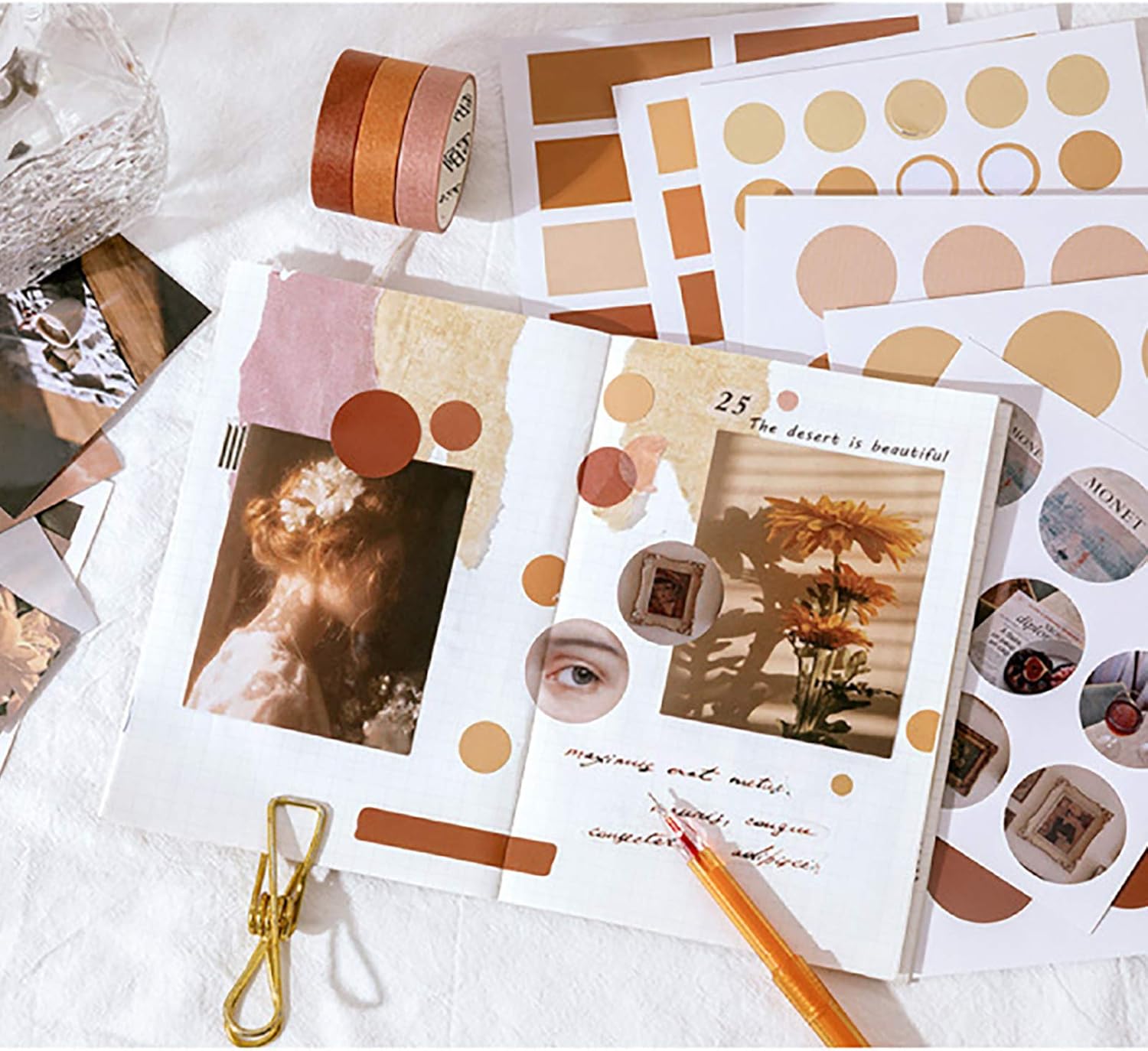 MAXLEAF 64PCS Literary Vintage Ins Style Scrapbook Bullets Journals Decoration Material Pack for DIY Scrapbook Album Decoration with Poster Tapes Stickers (Yellow)