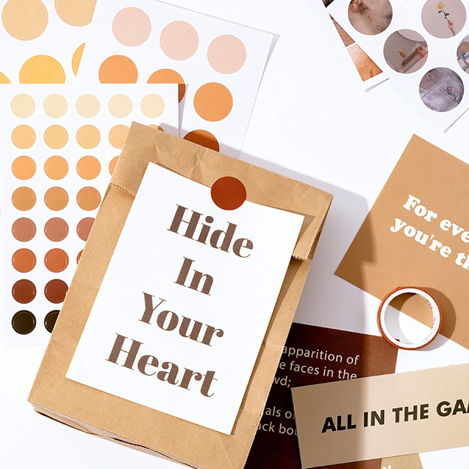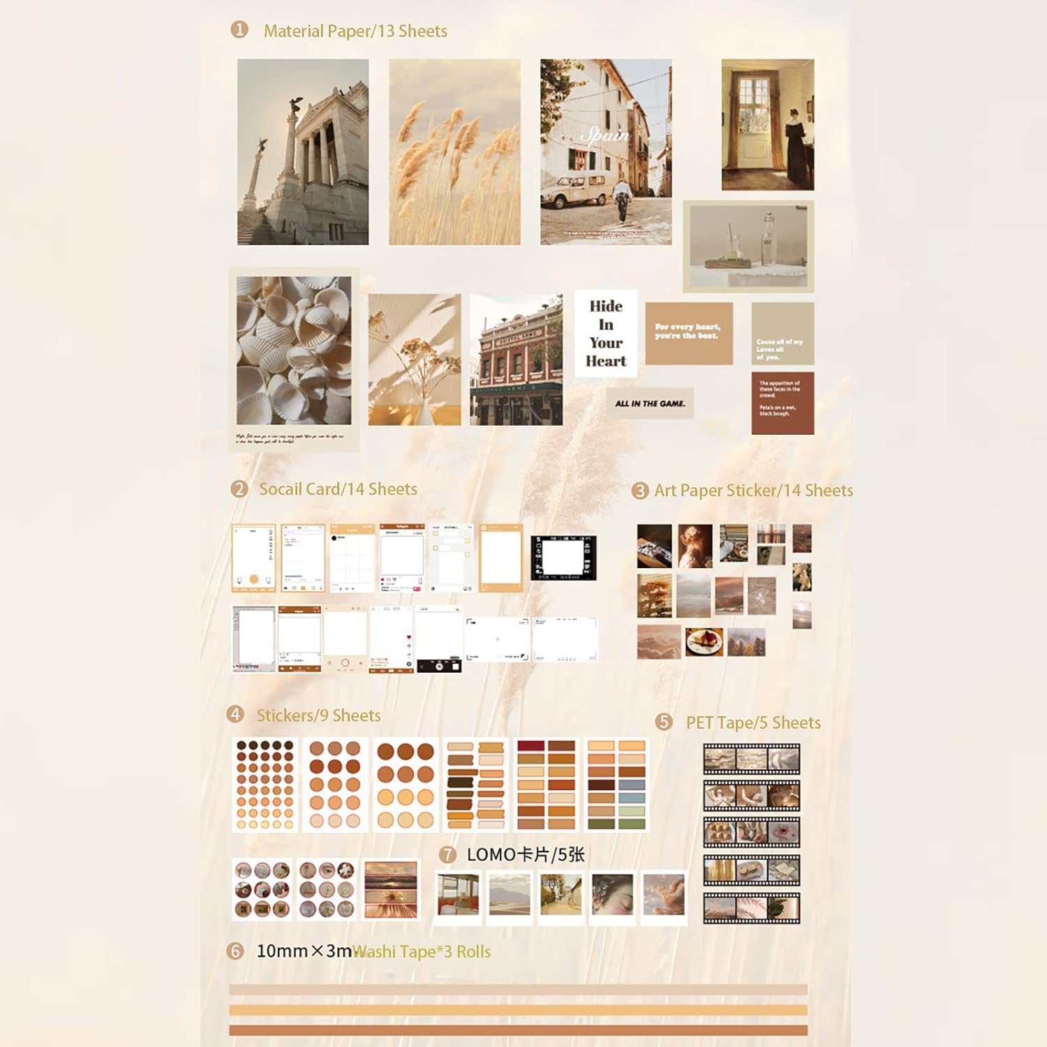- Big Series: 64PCS material elements, including A4 size poster x 4, A5 size poster x 4, coated paper stickers x 15 sheets, LOMO card x 5, PET transparent tapes x 5, mini coated stickers x 9 sheets, letter papers x 5pcs, washi tapes x 3 rolls, writable social cards x 14pcs. A really big series material for decoration.