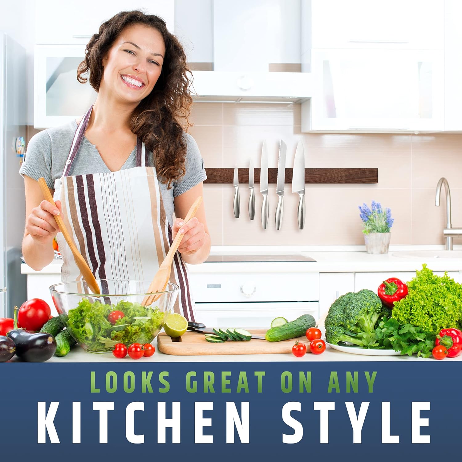 - SIMPLE & ELEGANT MODERN DESIGN: Made from high-quality, durable walnut wood, this 24’’ magnetic knife holder has a sleek design that complements any kitchen style. It "floats" on your wall, hiding magnets and screws, blending seamlessly into your kitchen decor.
