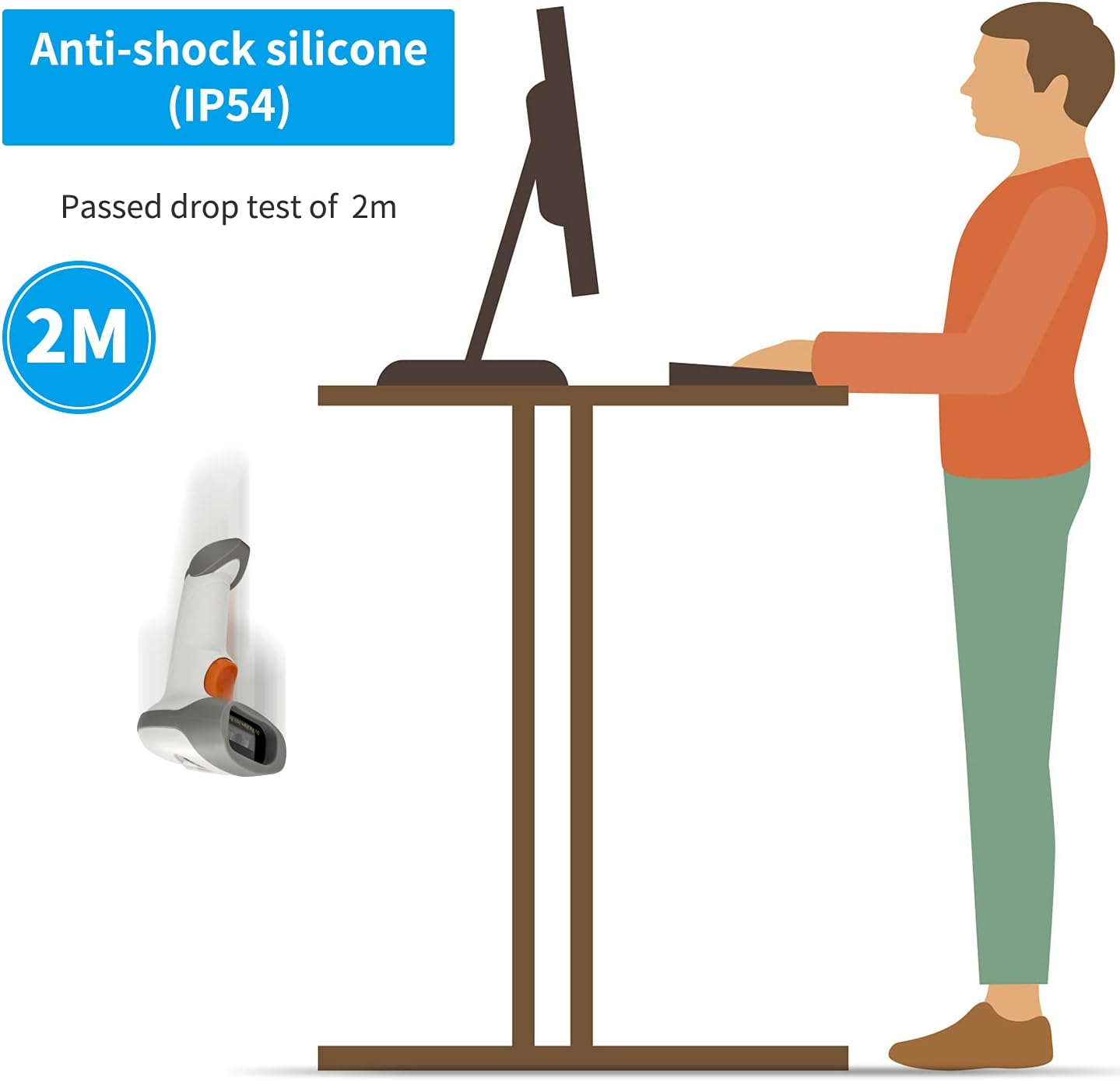 - ▲Professional Anti-Shock Design - Made of great ABS+PC materials,high shock-resistant, and the silicone protective cover can avoid the scratches and friction while falling from the height of 6.57 feet; the technical of IP54 sturdy which protect the wireless barcode scanner from dust and moisture.