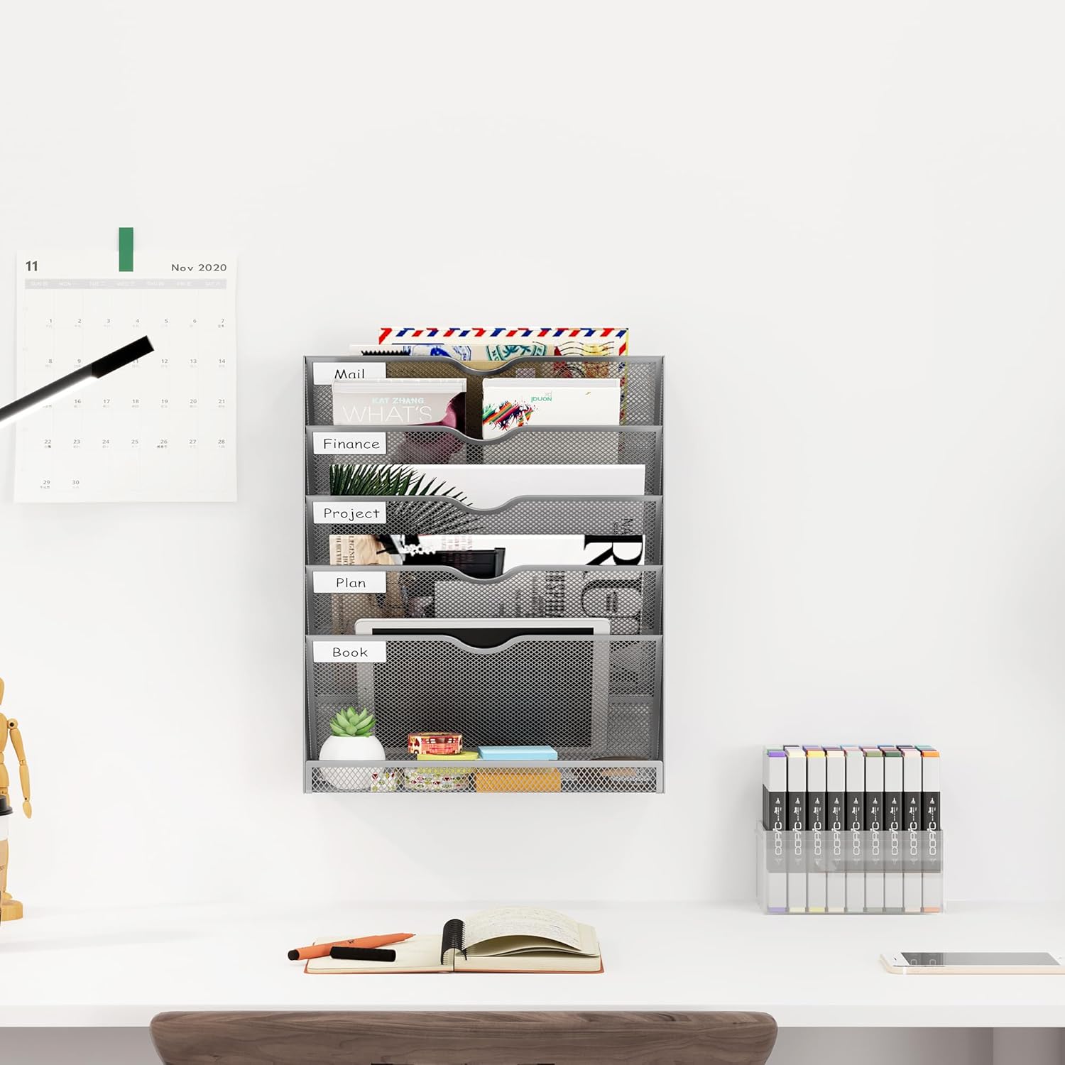 - Wall File Holder with Bottom Tray : 5 vertically arranged pockets for letter-sized files, easy storage and organization files, A4 folders, and documents. A flat tray at the bottom that can hold pens, pencils, scissors, rulers and other accessories.