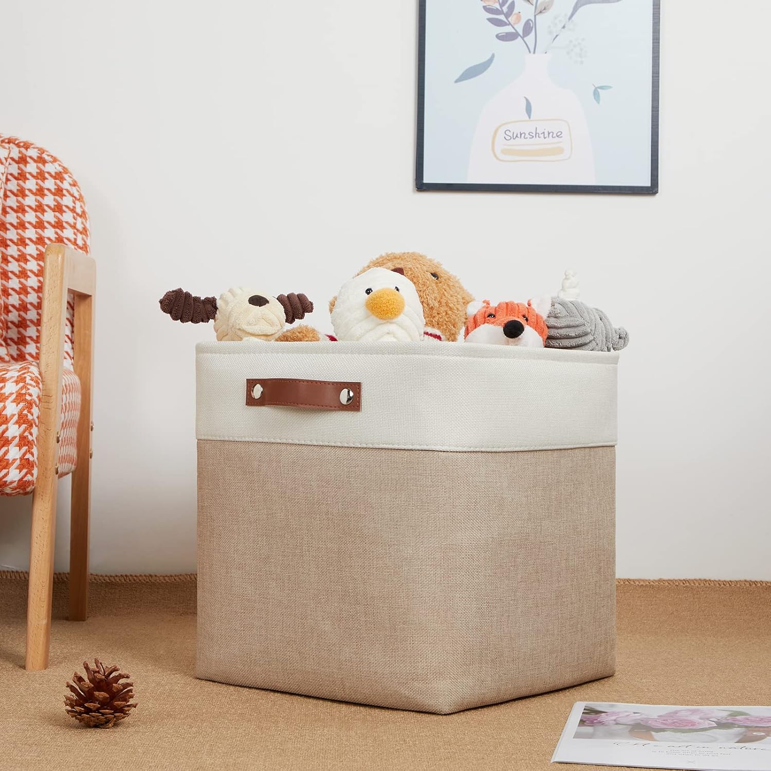 - 【Material】These cube storage bins are constructed of sturdy and attractive linen & EVA with linen interior lining. The sturdy leather handles make it easy to carry or pull off and out of shelves.