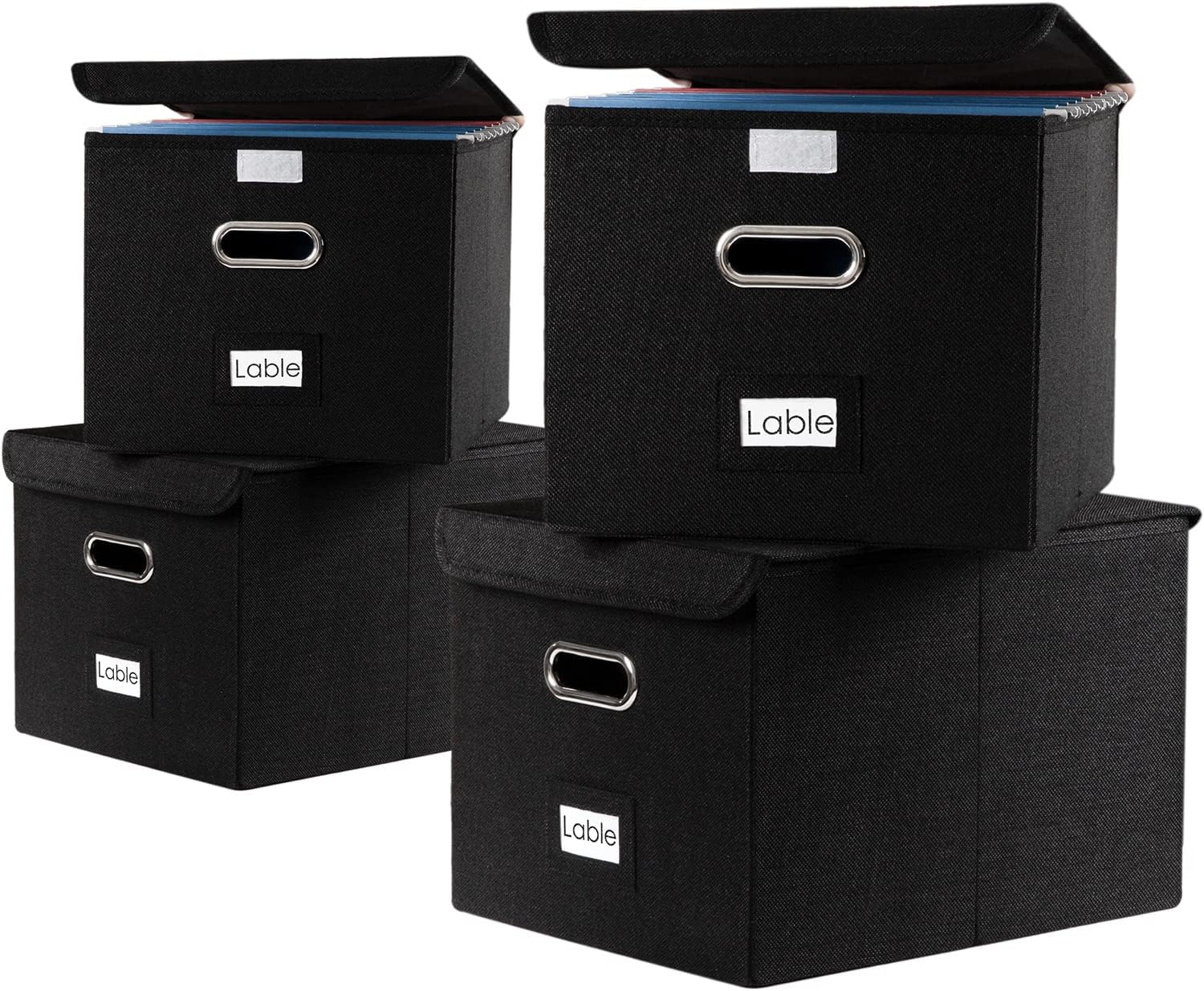 PRANDOM File Organizer Box - Set of 4 Collapsible Decorative Linen Filing Storage Hanging File Folders with Lids Office Cabinet Letter Size Black (15x12.2x10.75 inch)