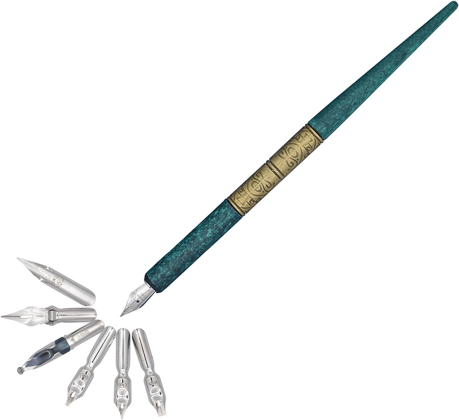 Gullor Wooden Dip Pen Calligraphy Set with Black Ink & 6 Nibs for Beginners, Kids, Writing, Signatures and Drawing, Ancient Cyan