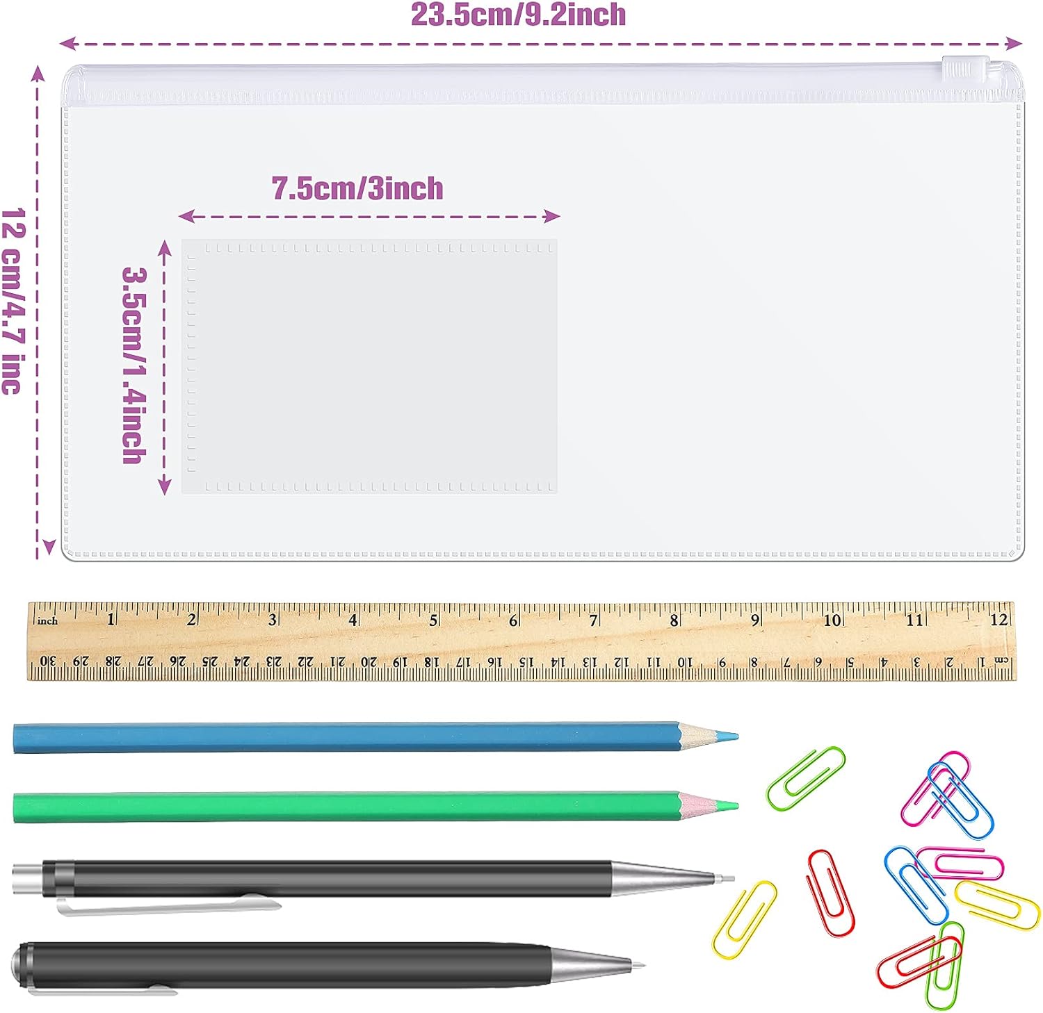 - Product size: the zipper envelopes are about 9.2 x 4.7 inch/ 23.5 x 12 cm in size, 1.4 x 3 inch/ 3.5 x 7.5 cm in business card pocket size on their surfaces, suitable for storing A6 size files and other items (thickness do not exceeded 3 cm
