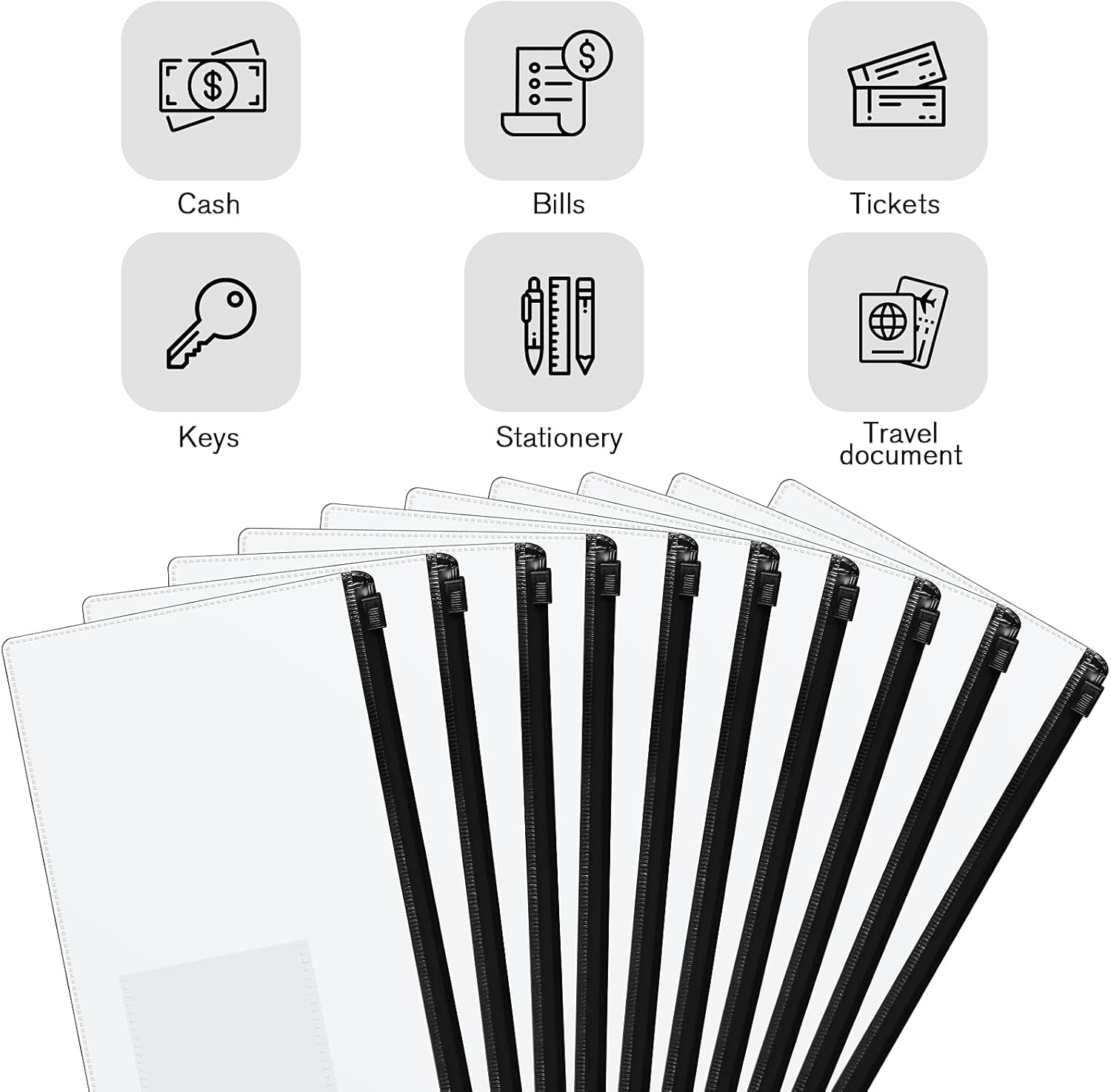 Marspark 100 Pieces Clear Pencil Case Zipper Envelope Bulk with Label Pocket Clear Plastic Envelopes with Zippered, A6 Pencil Bags for Cash, School Office Supplies, 9.2 x 4.7 Inches(Black)