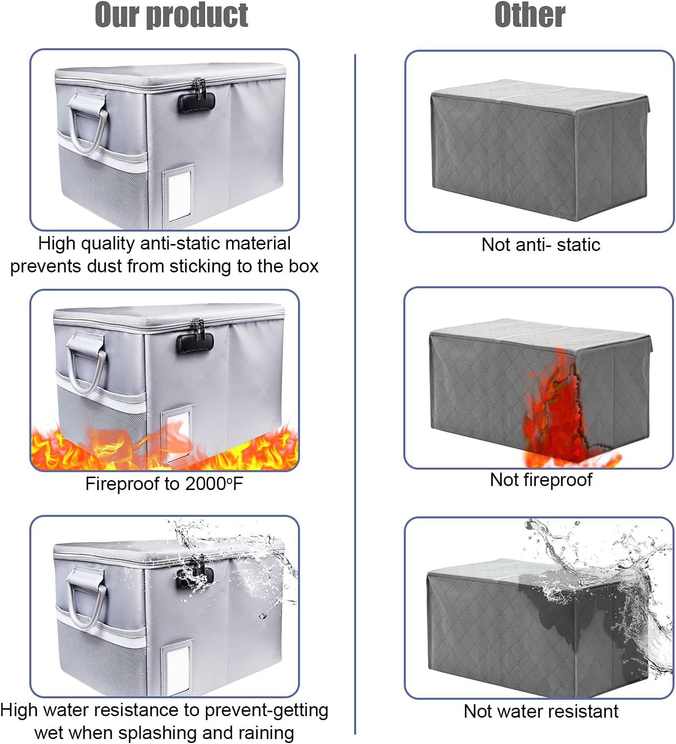 - Fireproof and water-resistant safe: The exterior material of Fireproof File Box is made of upgraded anti-static silicone coated fiberglass, which can withstand temperature up to 2000℉. Fireproof Document Box is not only fireproof but also highly water-resistant, so you don't have to worry about your important documents getting wet by rain.(Does not include folders)
