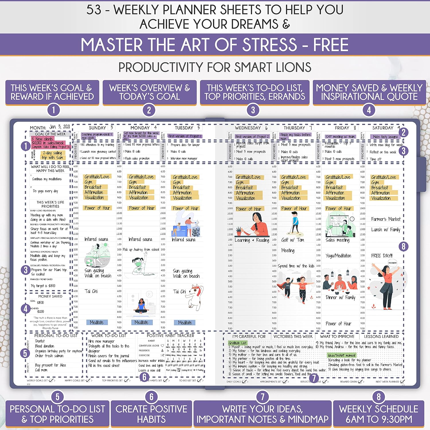 - SELF CARE PLANNER - This premium planner is undated and combines daily, weekly, and monthly planning features along with productivity, goal setting, business organization, to-do lists, notebook functionality, and gratitude journaling all in one. It includes goal-setting guidance that teaches you how to apply the law of attraction and vibration principles to become the best possible version of yourself on a mental, physical, and interpersonal level, thereby increasing productivity and happiness.