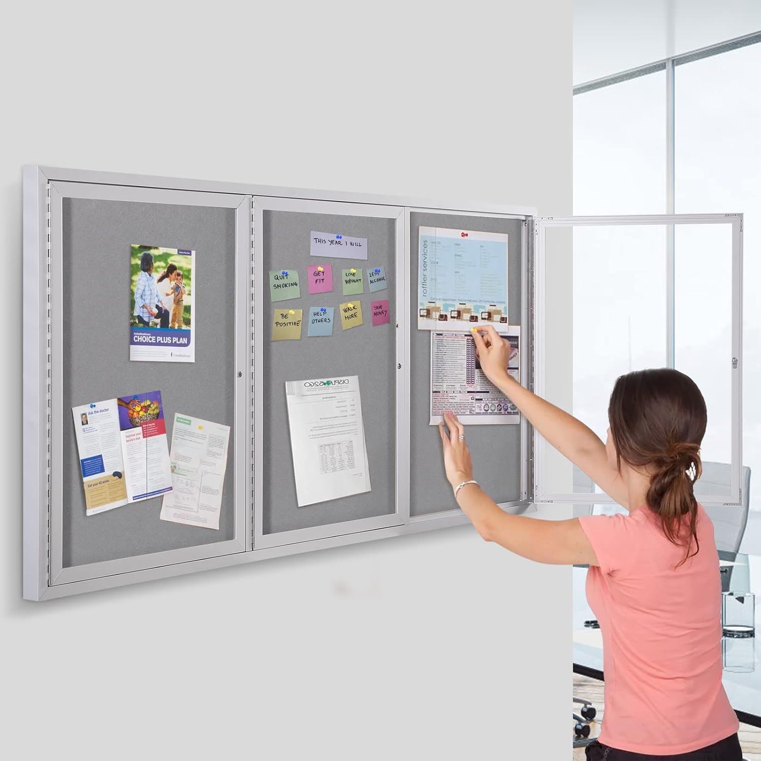SWANCROWN Weather Resistant Enclosed Bulletin Board Gray Fabric Displays Boards Wall Mounted Notice Cabinet with Three Locking Doors, 70x36 inches