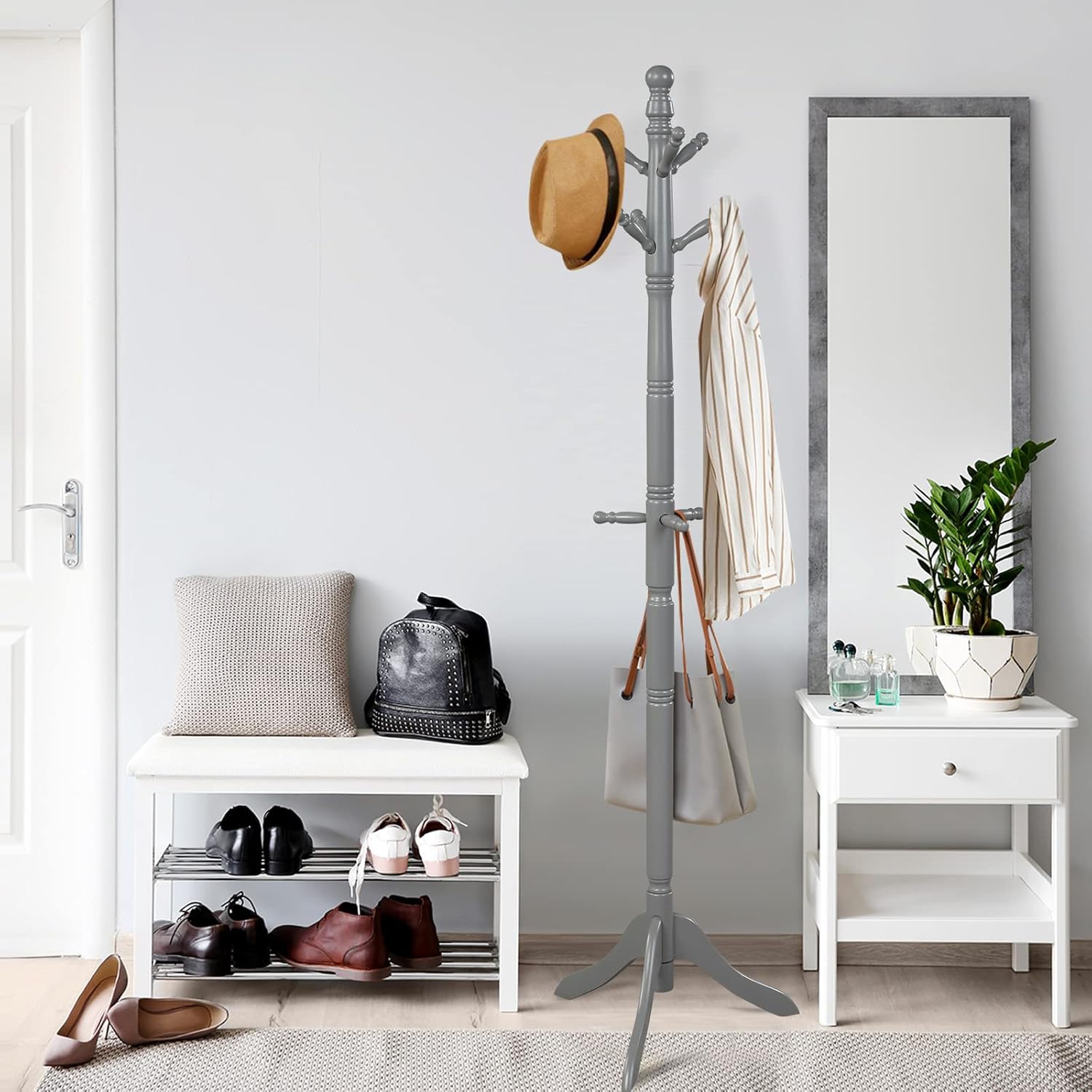 Tangkula Wood Coat Rack Freestanding, Entryway Height Adjustable Coat Stand with 9 Hooks & Stable Tri-Legged Base, Rubber Wood Coat Tree Hall Tree Coat Hanger for Home Office Hall Entryway (Grey)