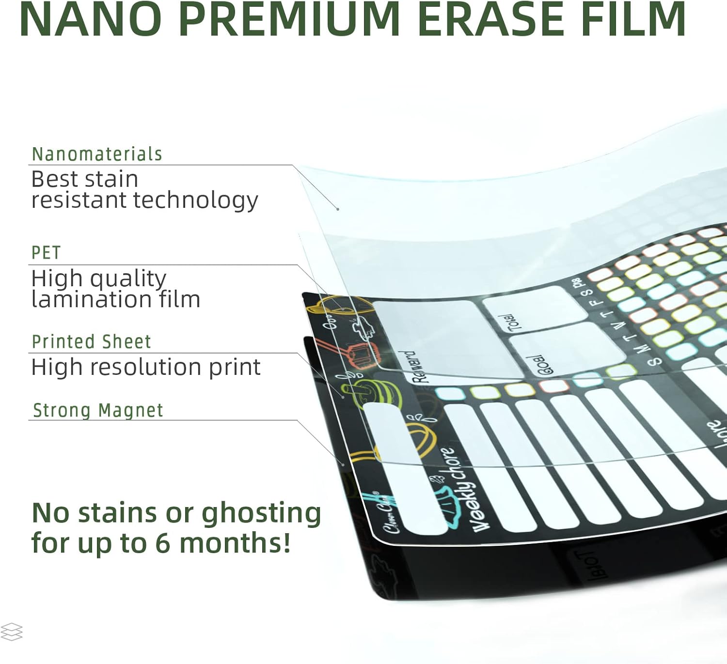 - NEW TECHNOLOGY, NEW EXPERIENCE - We use nano premium erase film on our products. Compared to the old PET film, the nano material will make your writings super easy to be wiped off even after you leave the writings on the planner for a very long time. And it won’t leave any stains or ghosting. The nano film is also waterproof, so if you want to clean the dry erase calendar with a wet cloth cause that’s your way. Just do it.