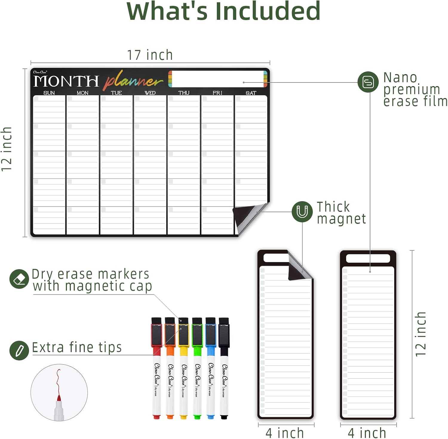 Magnetic Dry Erase Monthly Calendar - 17"x12" Monthly Calendar for Fridge - 4"x12" List Board 2 Pcs - 6 Extra Fine Point Markers Included - Shipped Flat